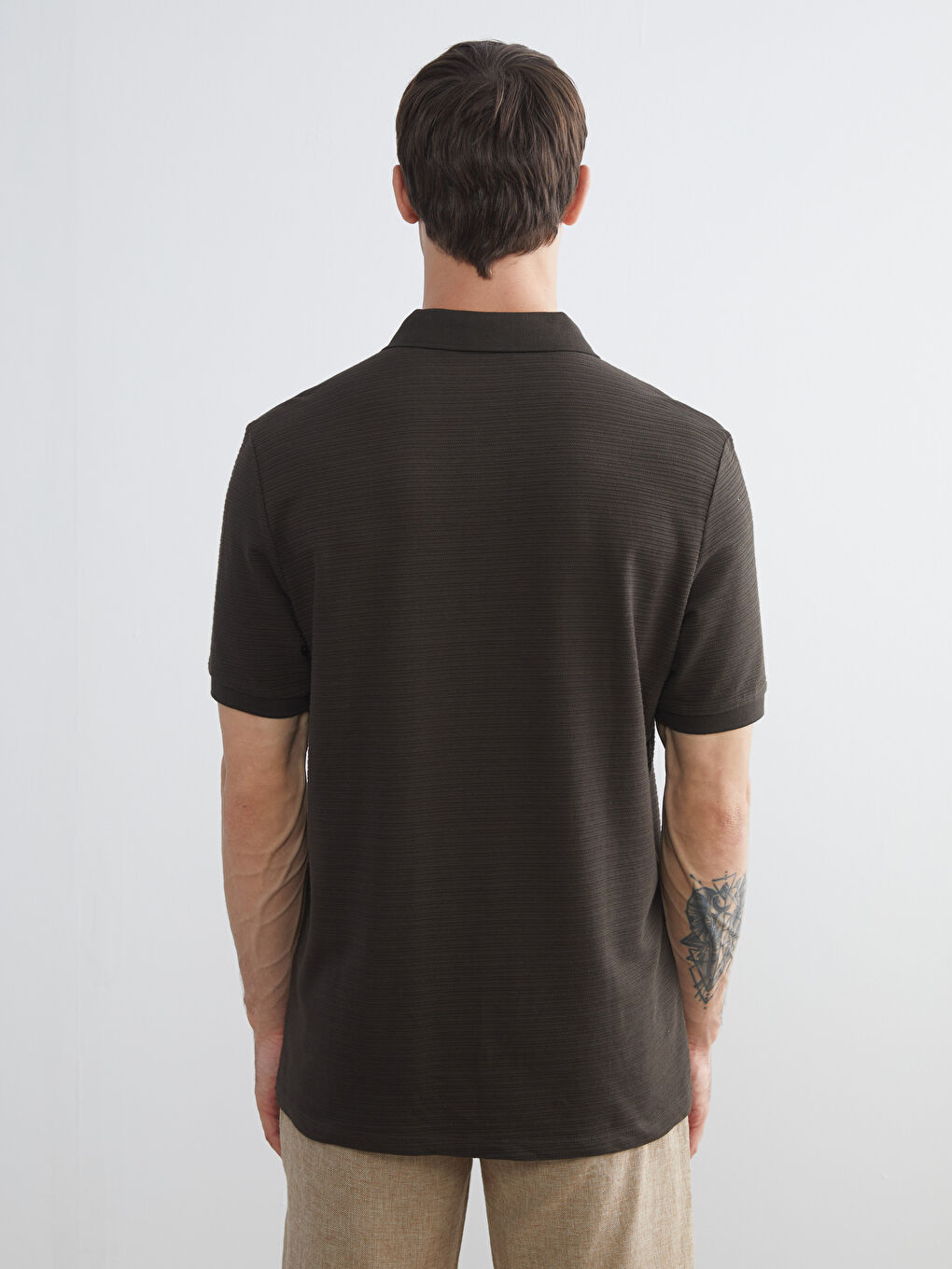 این تی شرت مردانه که با یقه پولو و آستین کوتاه طراحی شده است از پارچه ساده با بافت ژاکارد ساخته شده است.