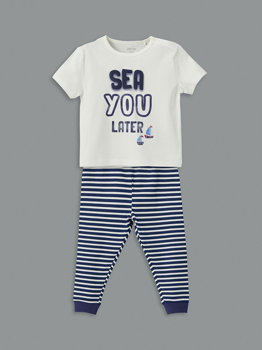 ست لباس خواب نوزاد پسر که از پارچه شانه شده 100% پنبه ساخته شده است از یقه خدمه، آستین کوتاه، رویه چاپ شده و قسمت پایین راه راه تشکیل شده است.