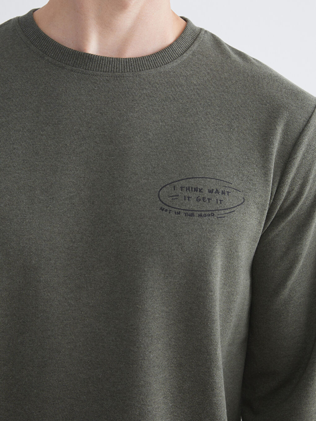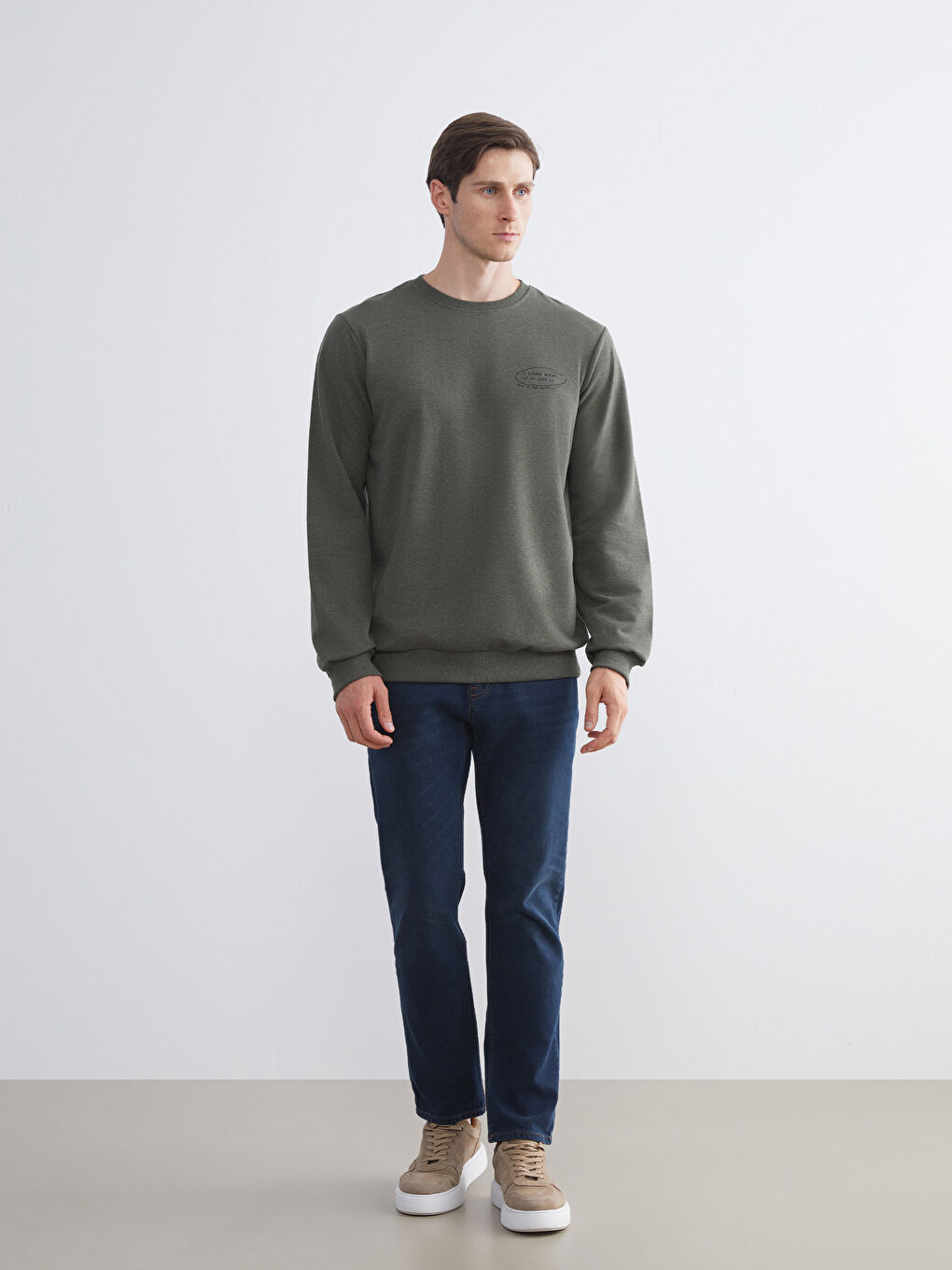 سویشرت مردانه آستین بلند با یقه خدمه. حداقل جزئیات چاپ روی سینه و آستین های آجدار و سجاف.