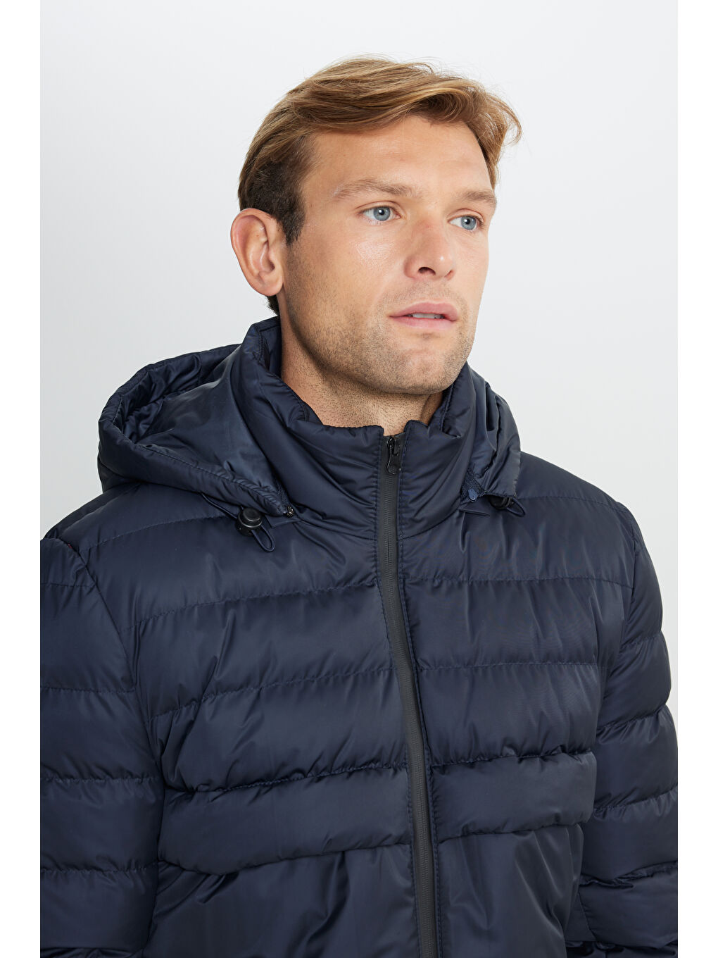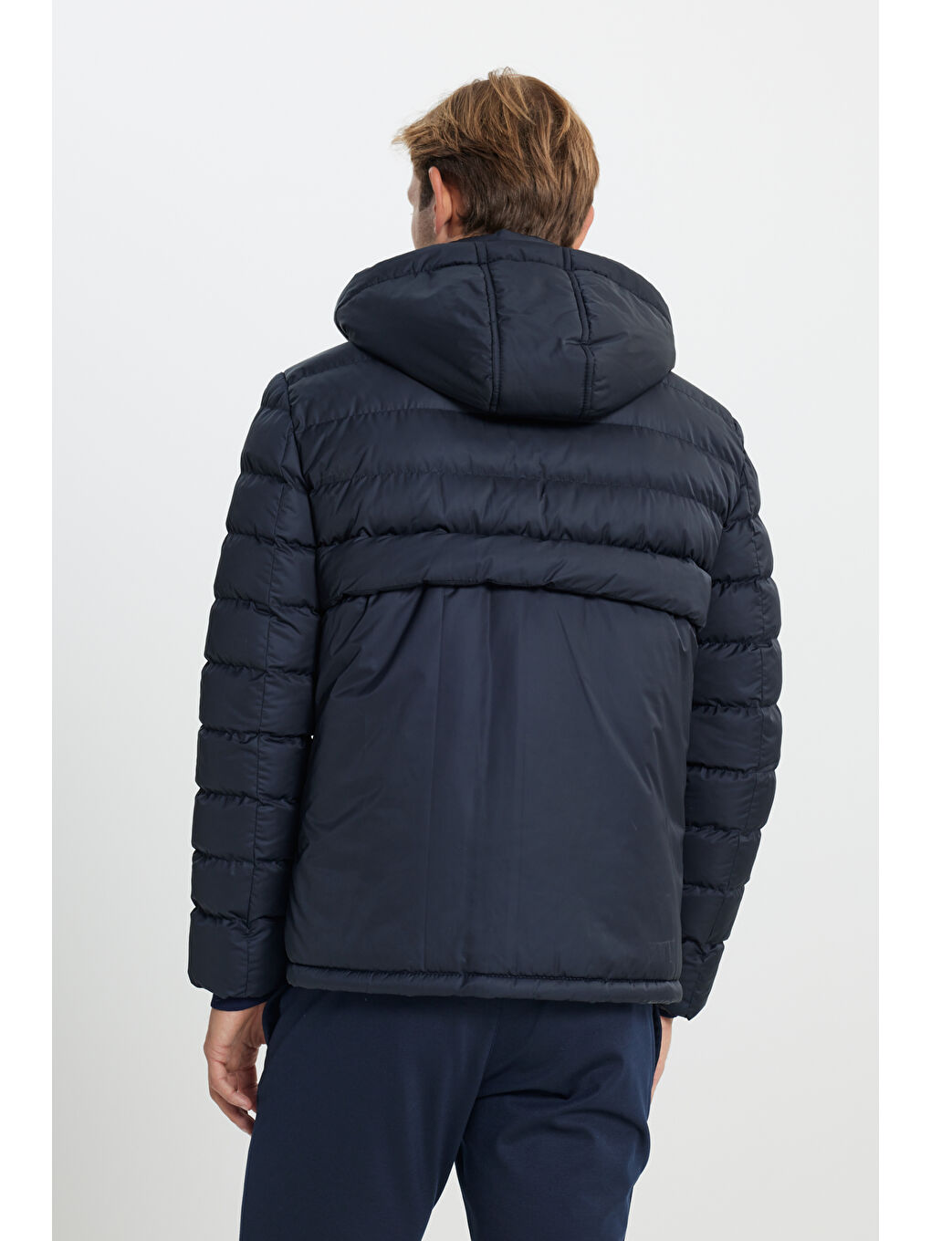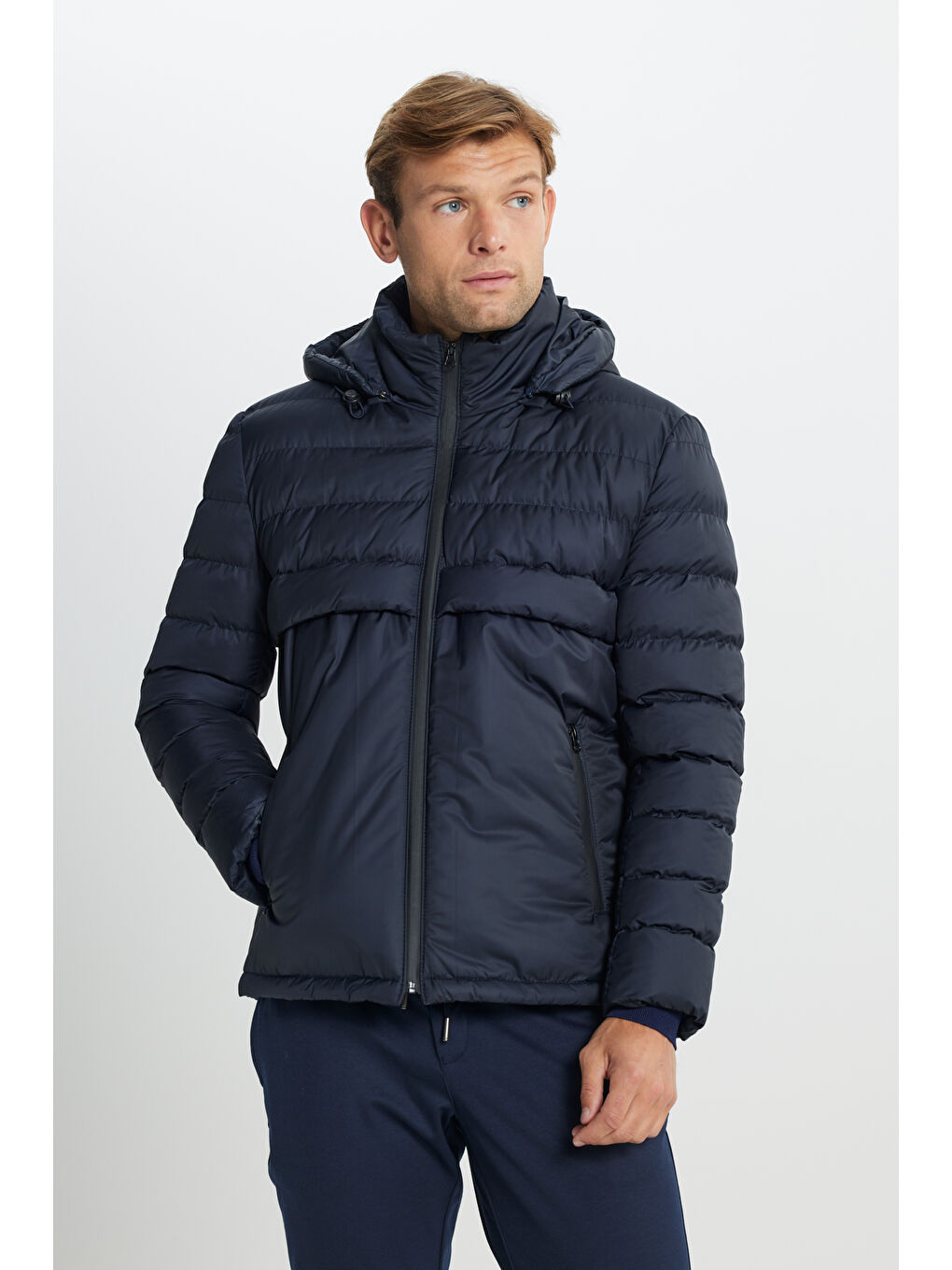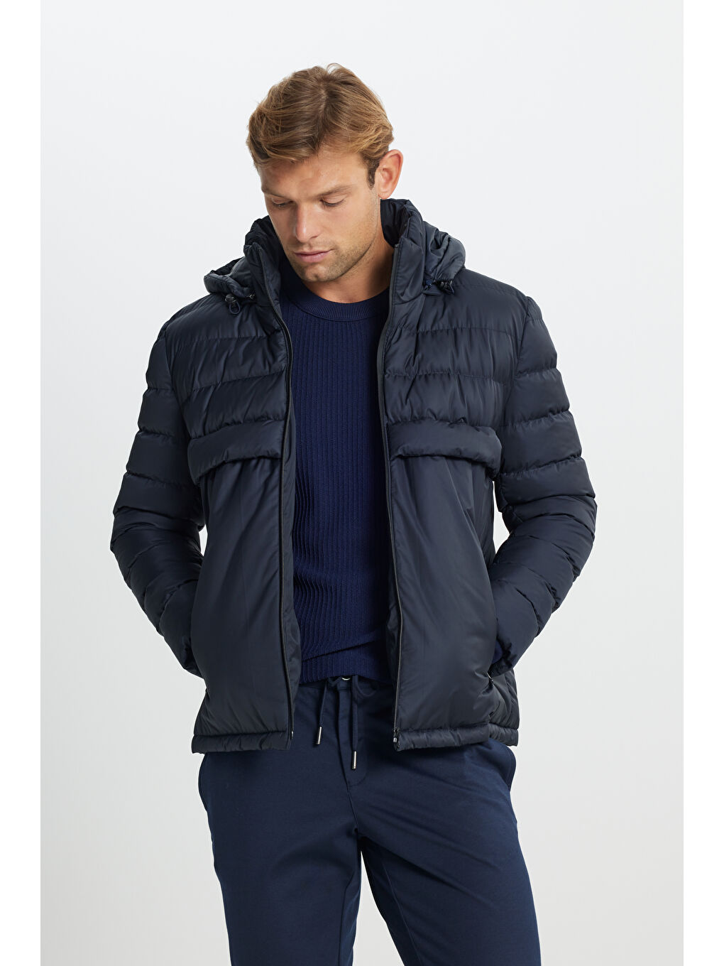 Erkek Lacivert Standart Fit Normal Kesim Çıkma Kapüşon Dik Yaka Yan Cepli Mont