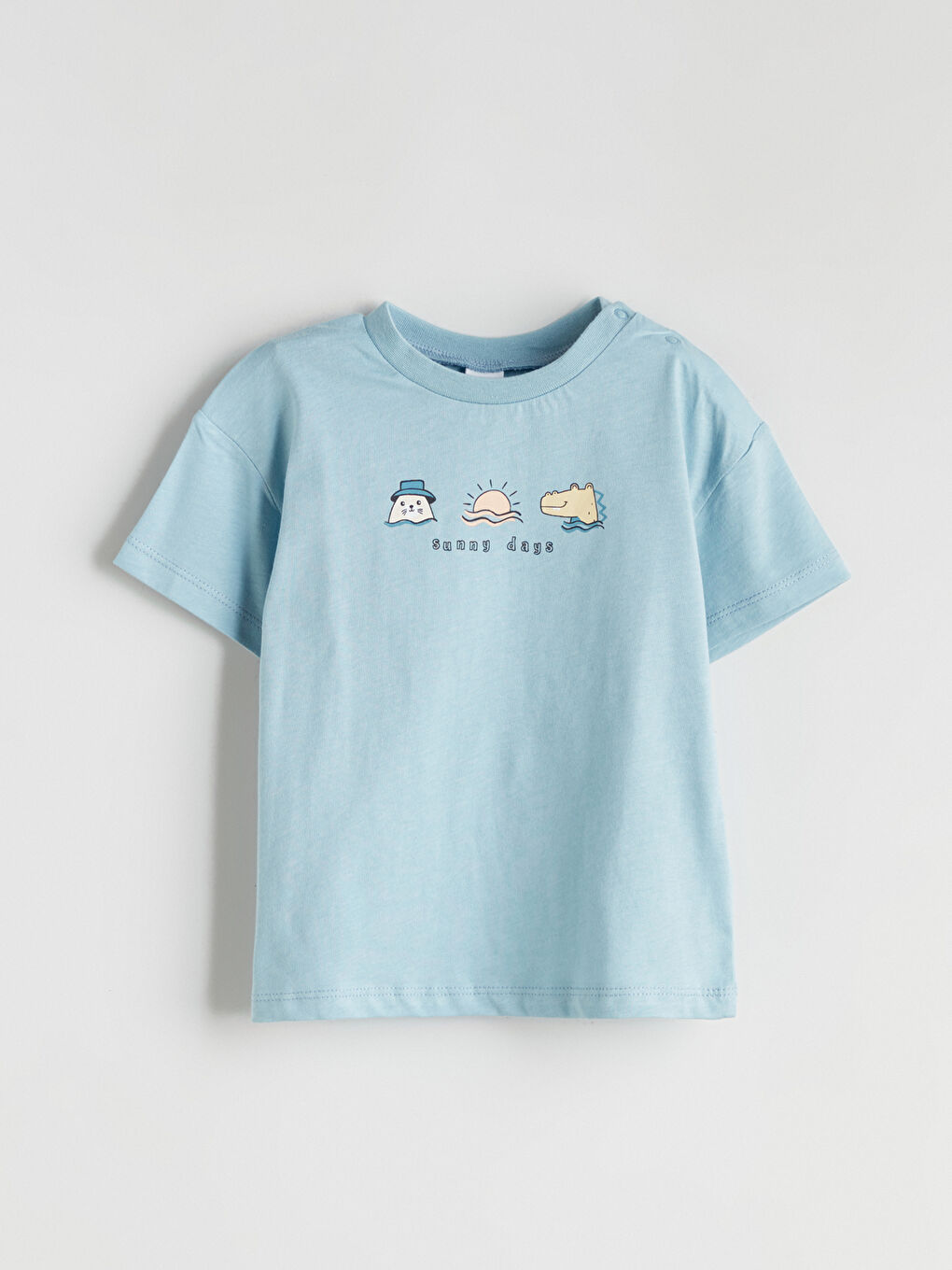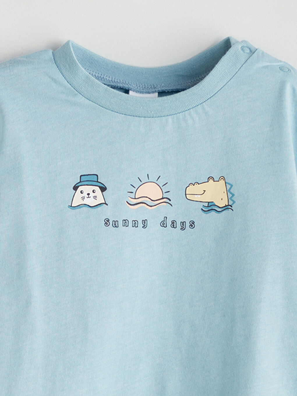 کت و شلوار نوزاد پسر از 100% پارچه نخی ساخته شده است و از دو تکه تشکیل شده است: یقه خدمه، آستین کوتاه، تی شرت چاپ شده و شورت کمری کش دار.