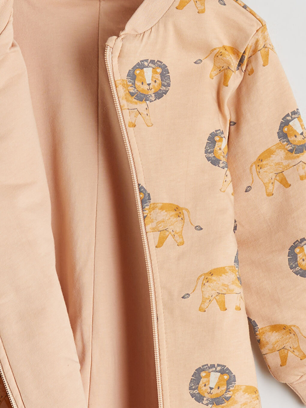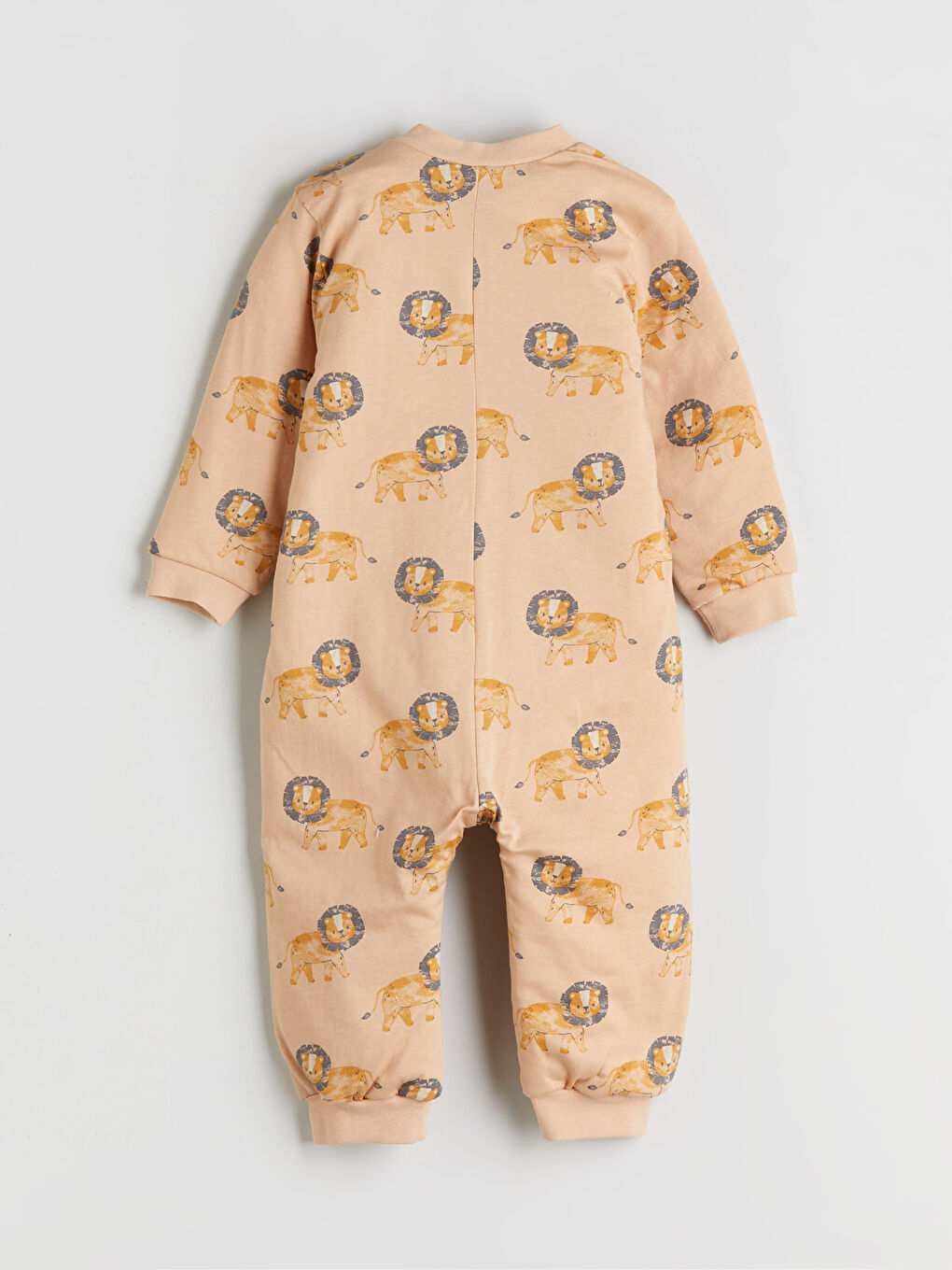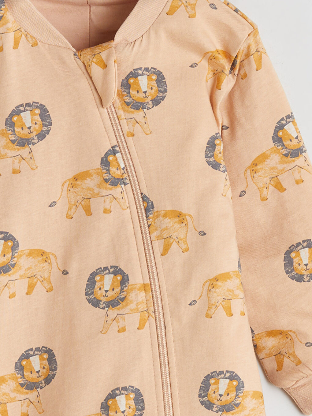سرهمی نوزاد پسر طرح دار از پنبه شانه شده. آستین بلند، یقه خدمه. بسته شدن زیپ نامتقارن و انتهای آستین و ساق آجدار.