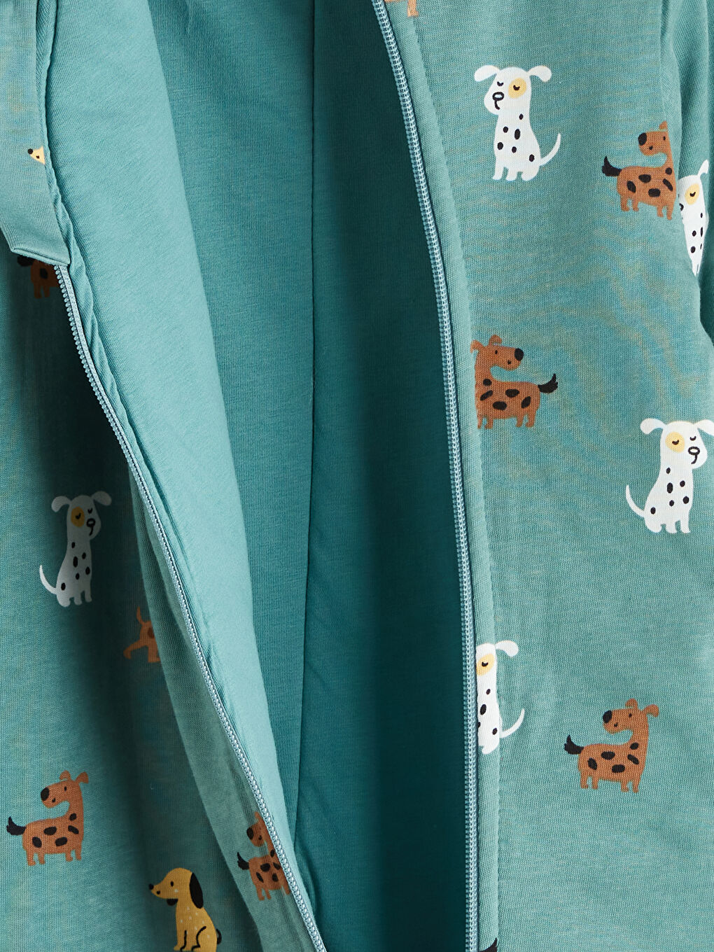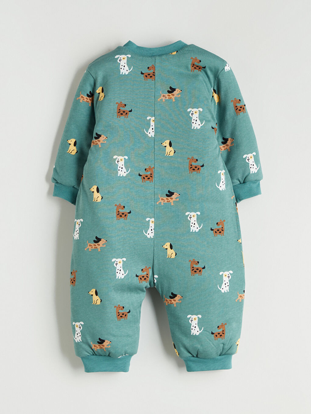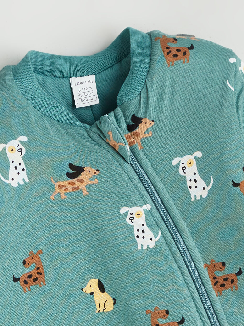 سرهمی نوزاد پسر از پارچه نخی 100% شانه شده. یقه خدمه، آستین بلند و طرح دار. انتهای آستین و ساق پا زیپ دار، آجدار.