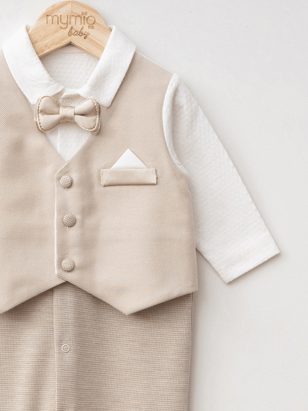 این مدل جلیقهای بچهدار پسرانه که مطمئناً مکمل استایل آقایان کوچولوی شما در مناسبتهای خاص است، با جزئیات چشمنواز خود متمایز است. این روفرشی نوزاد پسر که در رنگهای قهوهای طراحی شده است، با بالاپوش سفید پیراهن مانند، جزئیات جلیقه، و جزئیات پاپیون قابل جدا شدن، سبک مهمانی واقعی را منعکس میکند. بافت نرم و بسته شدن با دکمه در قسمت پایین آن را راحت و کاربردی می کند. این روپوش نوزاد پسر با فاق و پاپیون دکمهدار با پارچه 100% پنبهای سبک و قابل تنفس، روی پوست کودک شما ملایم است. این روفرشی شیک نوزاد پسر برای مناسبت های خاص، تولد، عکاسی در استودیو، تعطیلات یا جشن های مذهبی مناسب است.