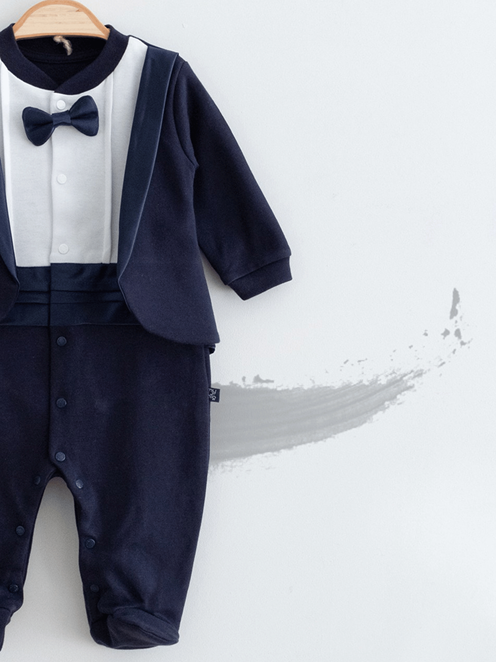 این رومپ نوزاد پسر با طراحی تاکسیدو که مطمئناً مکمل استایل آقایان کوچولوی شما در مناسبت های خاص است، با جزئیات چشم نواز خود متمایز می شود. این رومپر نوزاد پسر که در تناژهای مشکی و سفید متضاد طراحی شده است، سبک مهمانی واقعی را با ظاهر کت تاکسیدو و جزئیات پاپیون خود منعکس می کند. بافت نرم و بسته شدن با دکمه در قسمت پایین آن را راحت و کاربردی می کند. این رومپر نوزاد پسر، دارای یک پاپیون و بسته شدن دکمه ای در جلو و فاق است، با پارچه 100% پنبه ای سبک و قابل تنفس، روی پوست کودک شما ملایم است. این یک انتخاب شیک برای مناسبت های خاص، تولدها، عکاسی در استودیو، تعطیلات، یا جشن های مذهبی است.