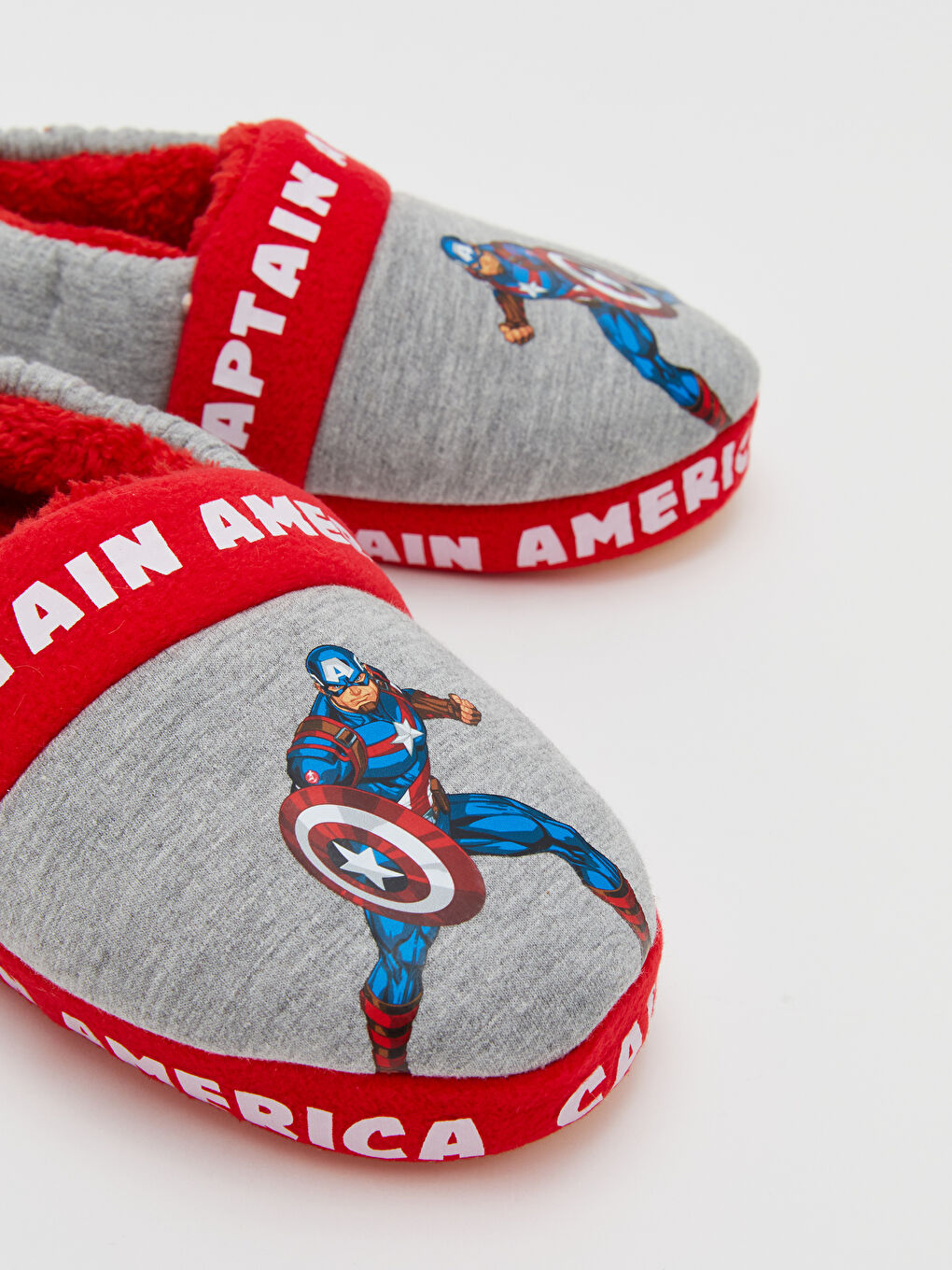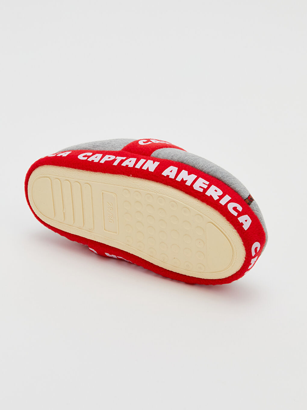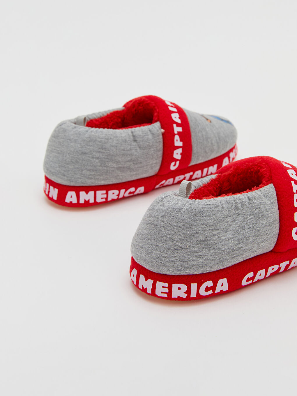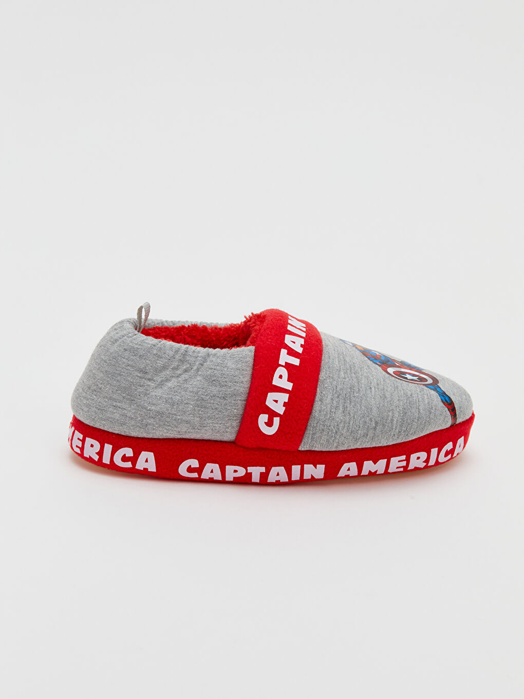 دمپایی خانه نوزاد پسر با چاپ کاراکتر و متن دارای مجوز کاپیتان آمریکا است. آستر مخملی و یک حلقه کششی در پشت.