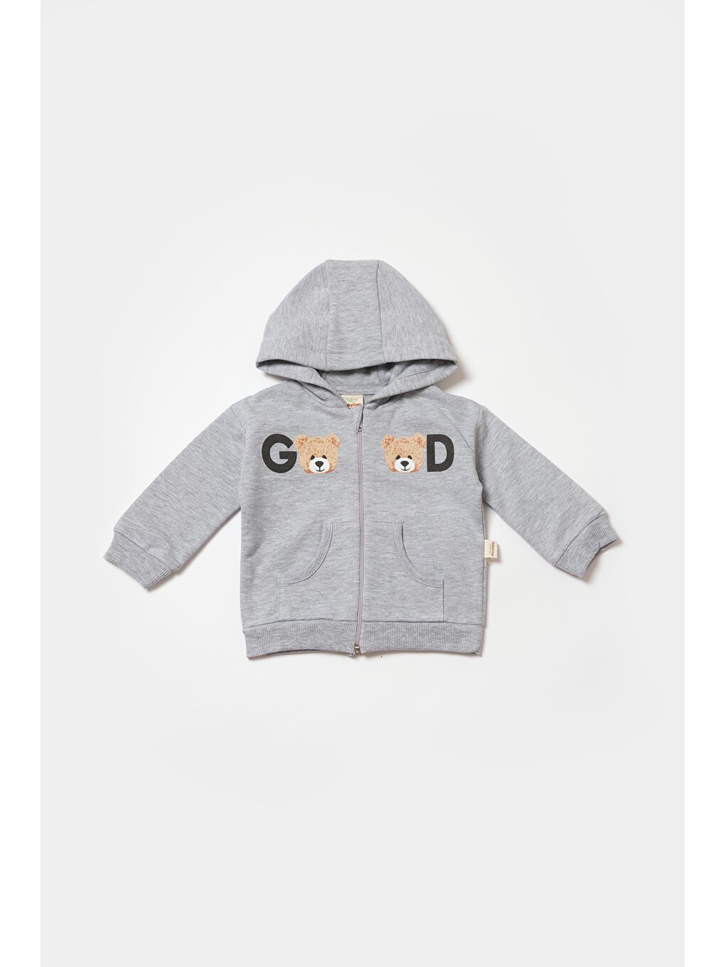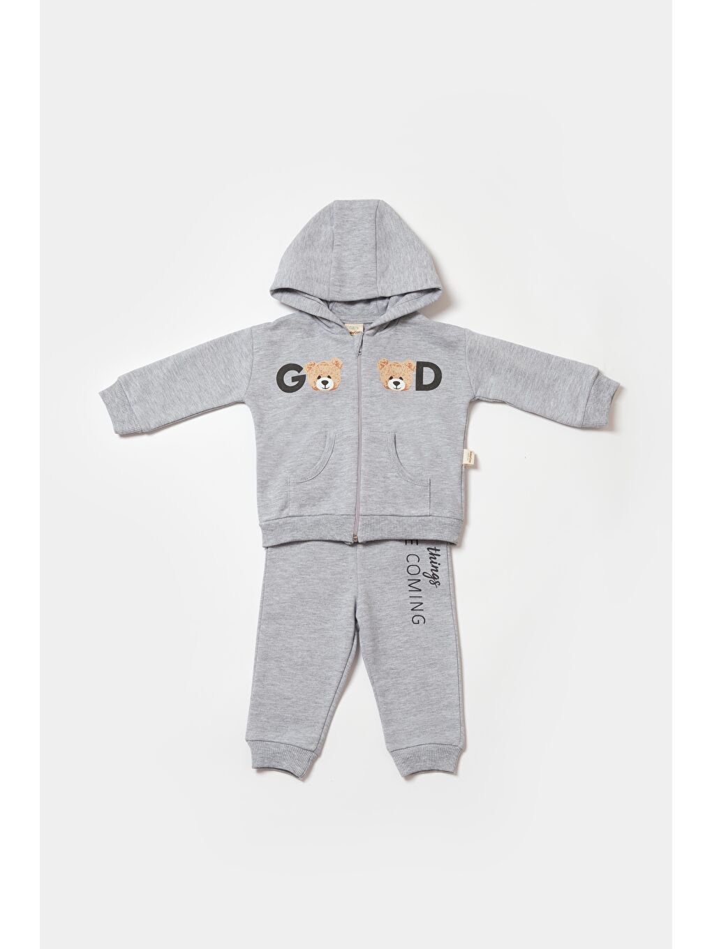 ست لباس ورزشی بچه گانه نخی طوسی با کلاه خرس عروسکی – دو تکه