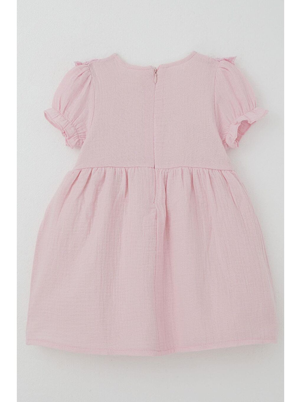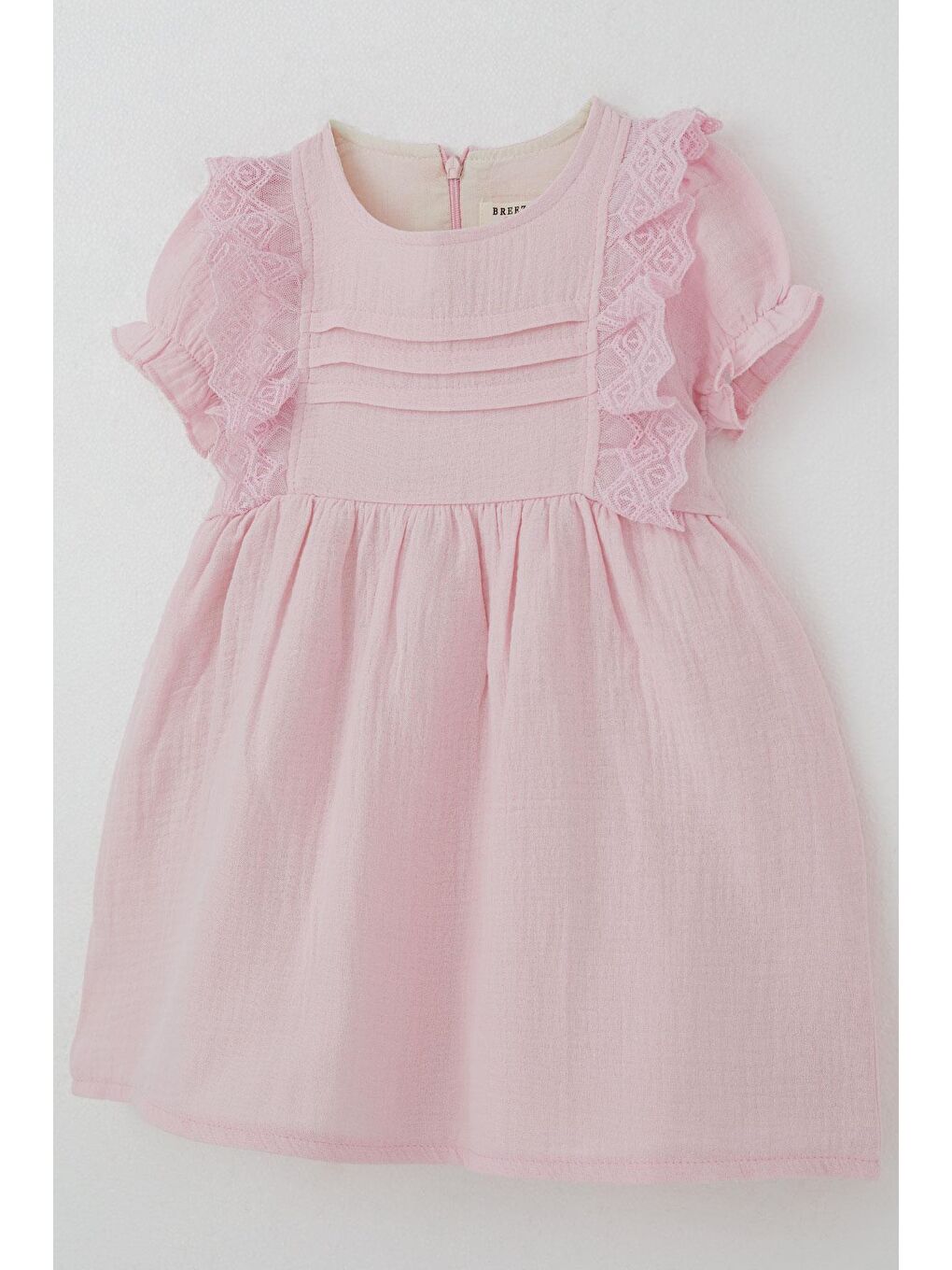 لباس نوزاد دخترانه صورتی با جزئیات گیپور روی شانه و آستین های کشسان (9 ماهگی تا 3 سالگی)