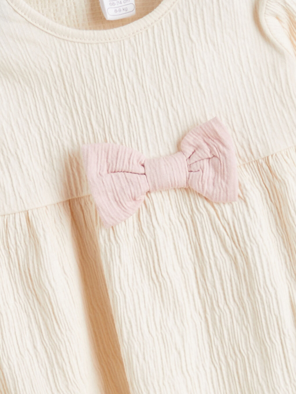یقه خدمه، ست نوزاد دخترانه آستین بلند. شامل یک بلوز با بسته شدن سریع روی شانه ها، یک پاپیون روی سینه و یک شلوار کش دار.