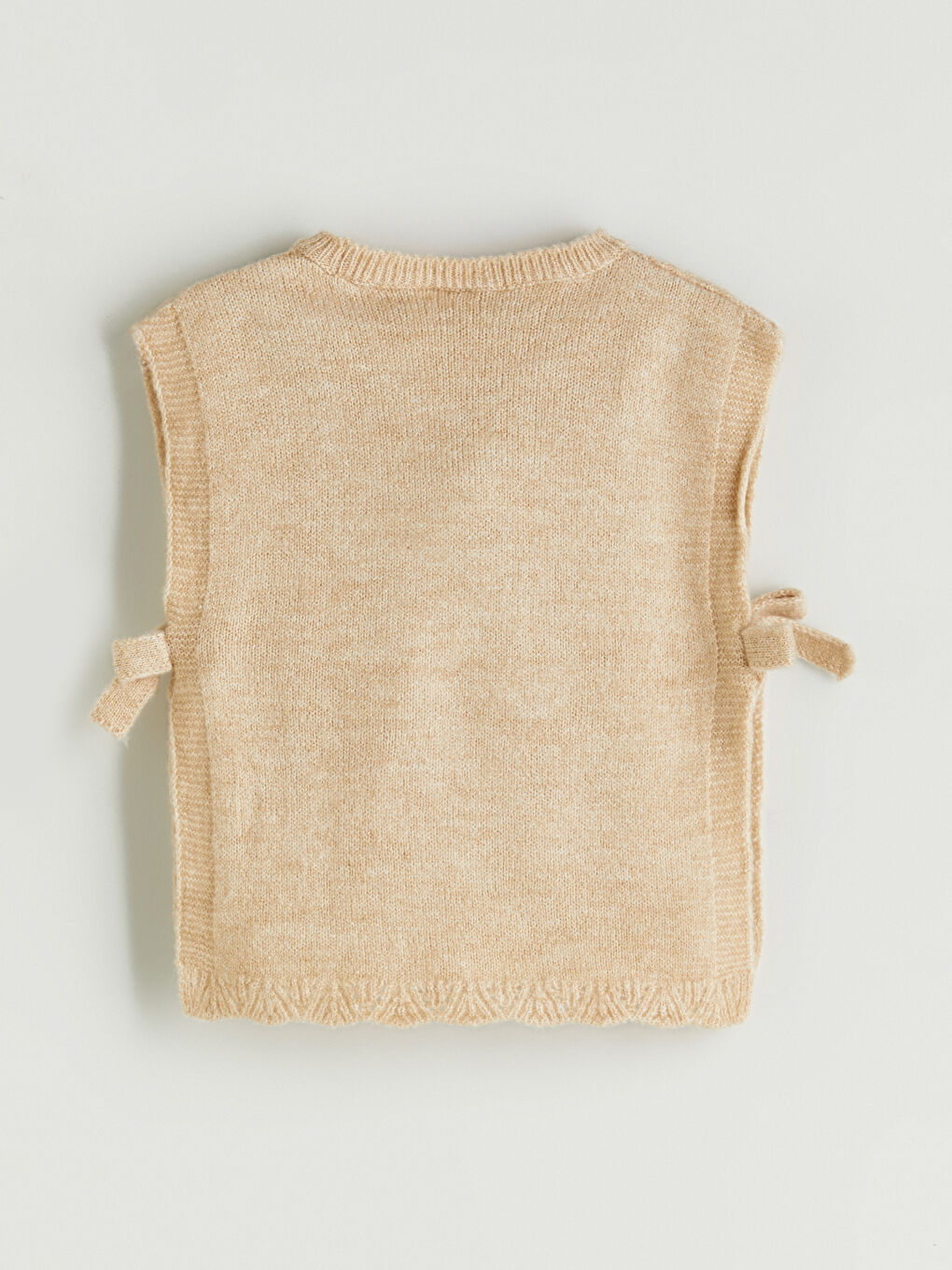 این ست سه تکه دخترانه شامل یک بلوز آستین بلند، ژاکت بافتنی و شلوار است. بلوز یقه بچگانه دارد و ژاکت دارای جزئیات روبانی کناری است.