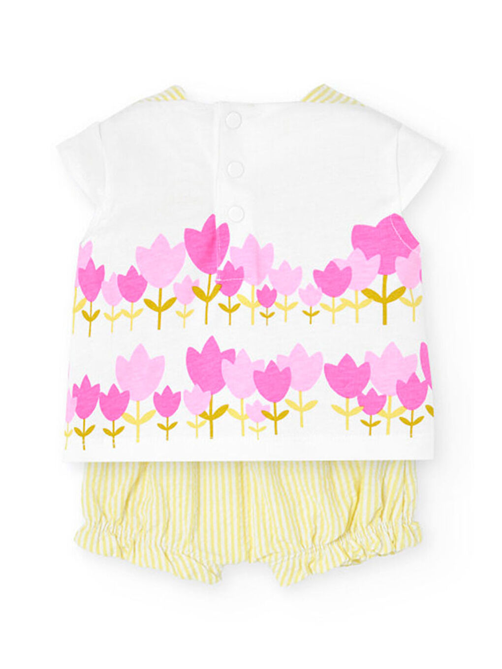 معرفی یک ست بافتنی سفید مناسب برای ماه های بهار و تابستان کودک شما. رویه دارای چاپ گلی جذاب در سایه های صورتی است که حسی شاد و تازه به آن می بخشد. این ماده نرم و راحت است و برای پوست حساس کودک ملایم است. شورت های موجود در ست دارای راه راه هایی به رنگ سبز است. این محصول برای سایزهای 1 ماه تا 2 سال مناسب است. این یک گزینه کاربردی برای پوشیدن روزمره است. به راحتی می توانید آن را با اکسسوری هایی در رنگ های پاستلی یا خنثی ست کنید.
