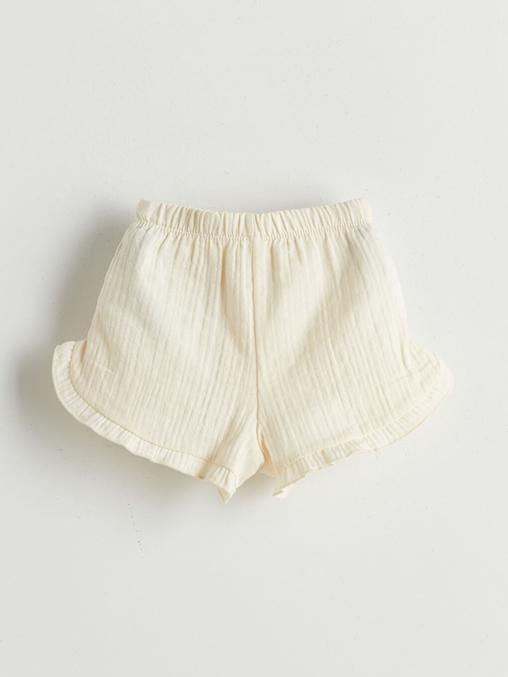 شورت نوزادی دخترانه از پارچه وافل نخی بلند، با کمر الاستیک و جزییات رفل روی پاها.