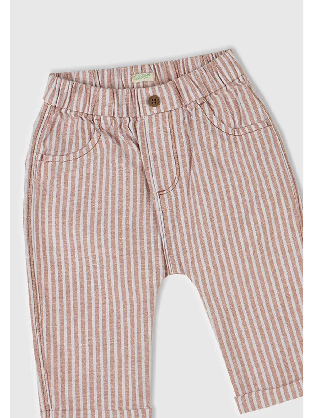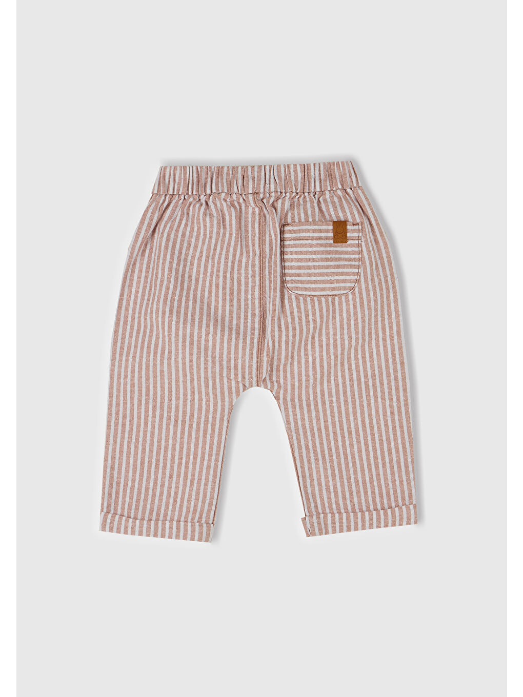 شلوار کمری الاستیک راه راه بژ با جیب وصله آرم پشتی