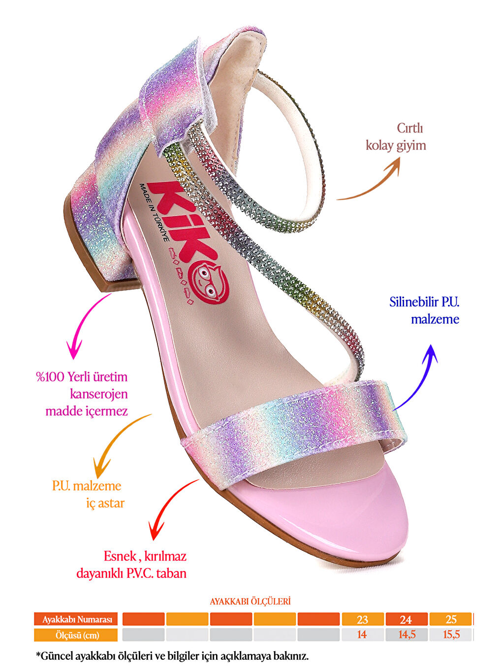 جنس بیرونی: میکروفیبر جنس داخلی: میکروفیبر جنس زیره: پی وی سی سبک توری: بند مچ پا اطلاعات طول: کاملاً برای اندازههای استاندارد پا قالبگیری شده است ارتفاع پاشنه: 2 سانتی متر ارتفاع زیره: 0.3 سانتی متر وزن هر جفت: 180 گرم اندازه گیری طول کفش داخلی 23: 14 سانتی متر 24: 14.5 سانتی متر 25: 15.5 سانتی متر