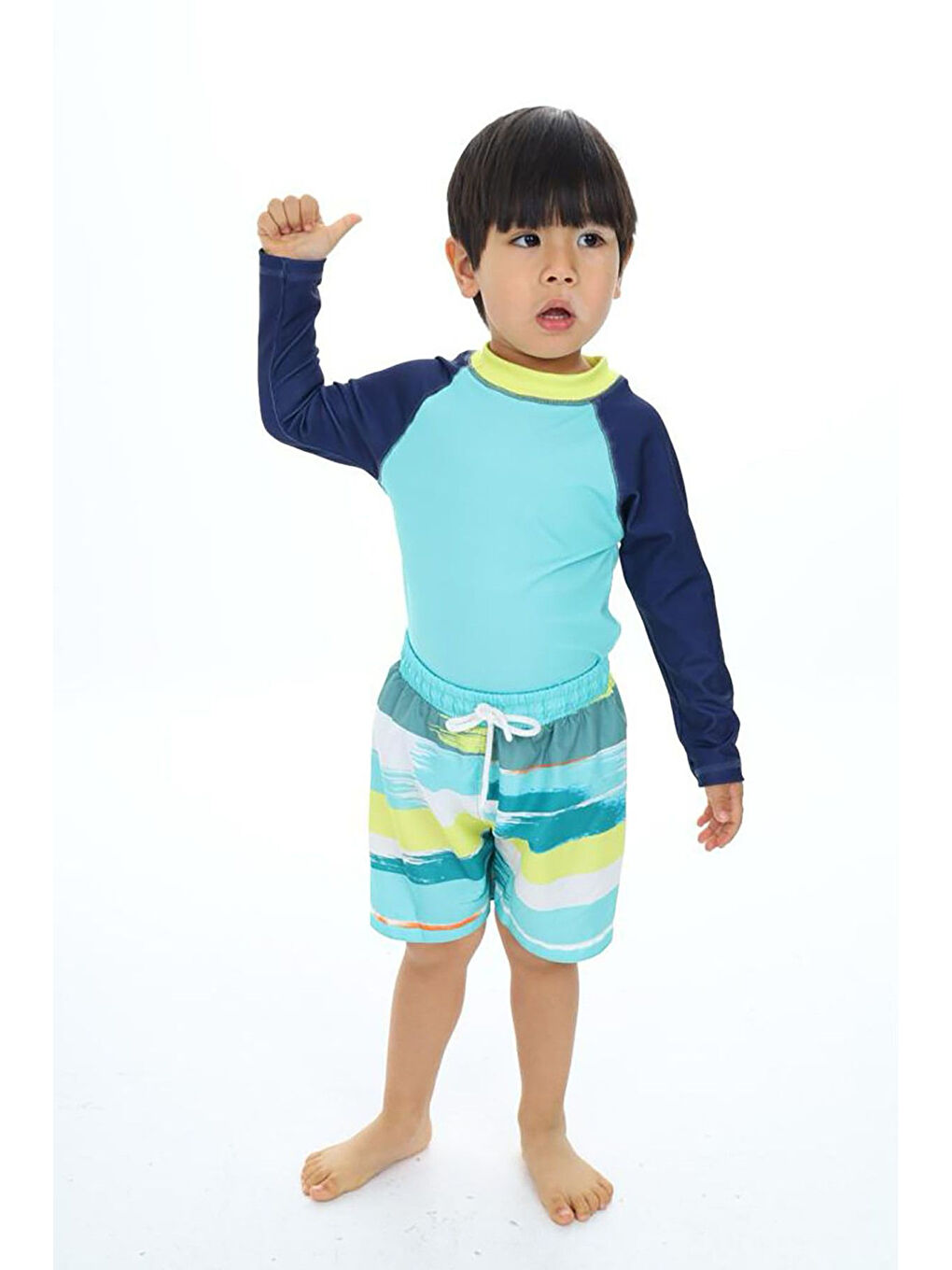 مایو فیروزه ای طرح دار محافظ در برابر آفتاب با شورت شنا