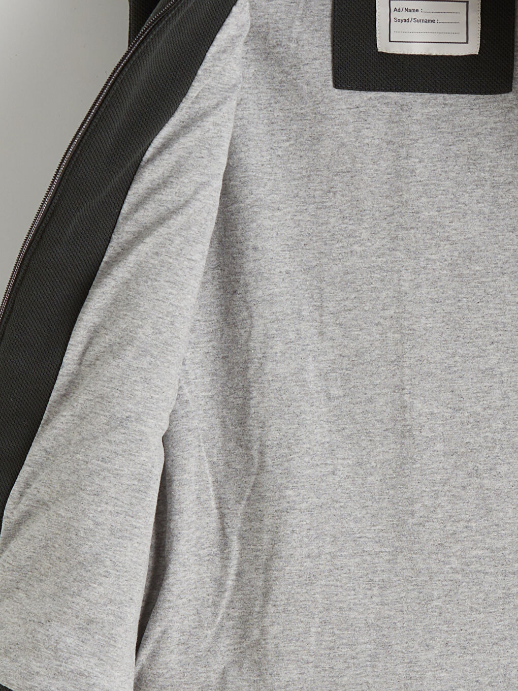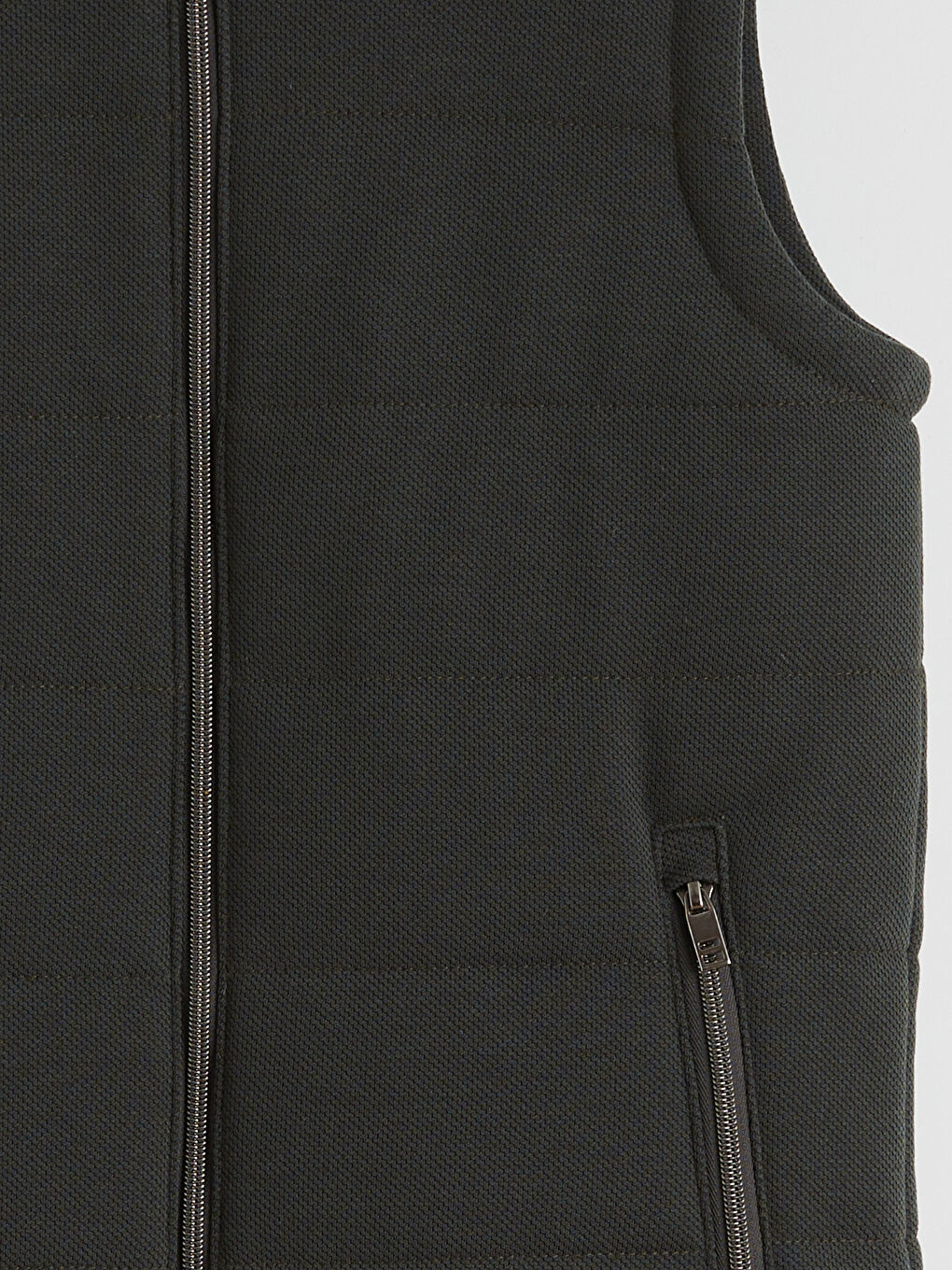 این جلیقه پسرانه دارای یقه ایستاده و طرح لحافدوزی شده است. دارای زیپ جلویی سرتاسری و جیبهای زیپدار کناری است.