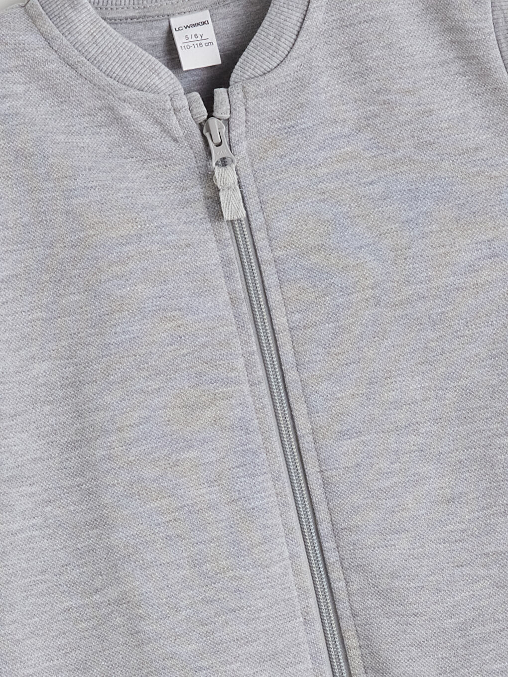 این جلیقه پسرانه از پارچه پیکه ساخته شده است. یقه خدمه و آستین دارد. دارای زیپ جلو و سجاف آجدار.