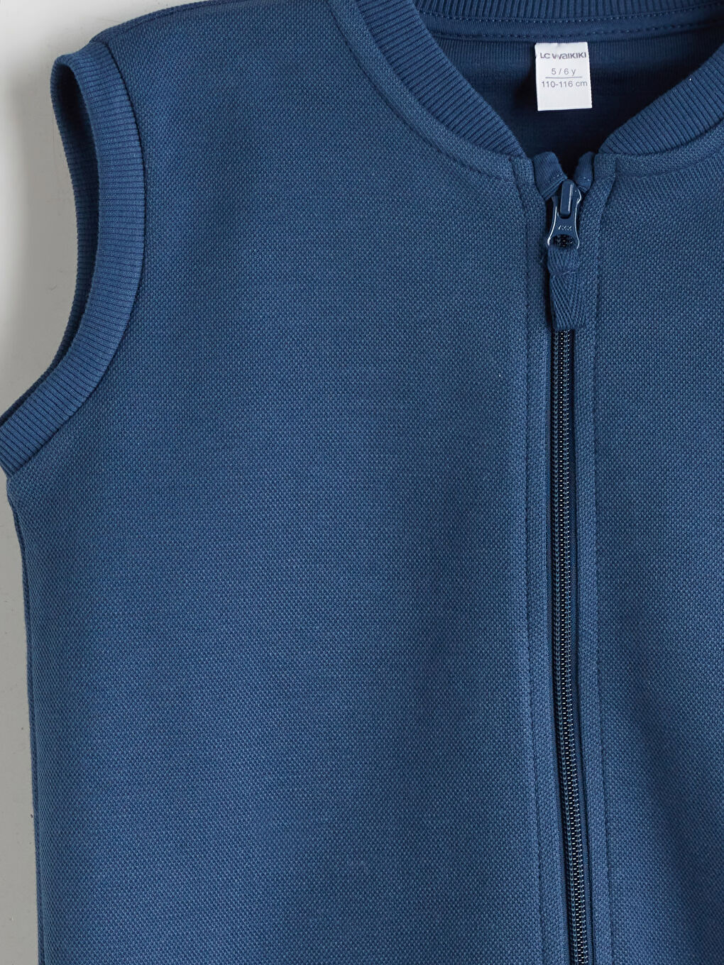 این جلیقه پسرانه از پارچه پیکه ساخته شده است. یقه خدمه و آستین دارد. دارای زیپ جلو و سجاف آجدار.