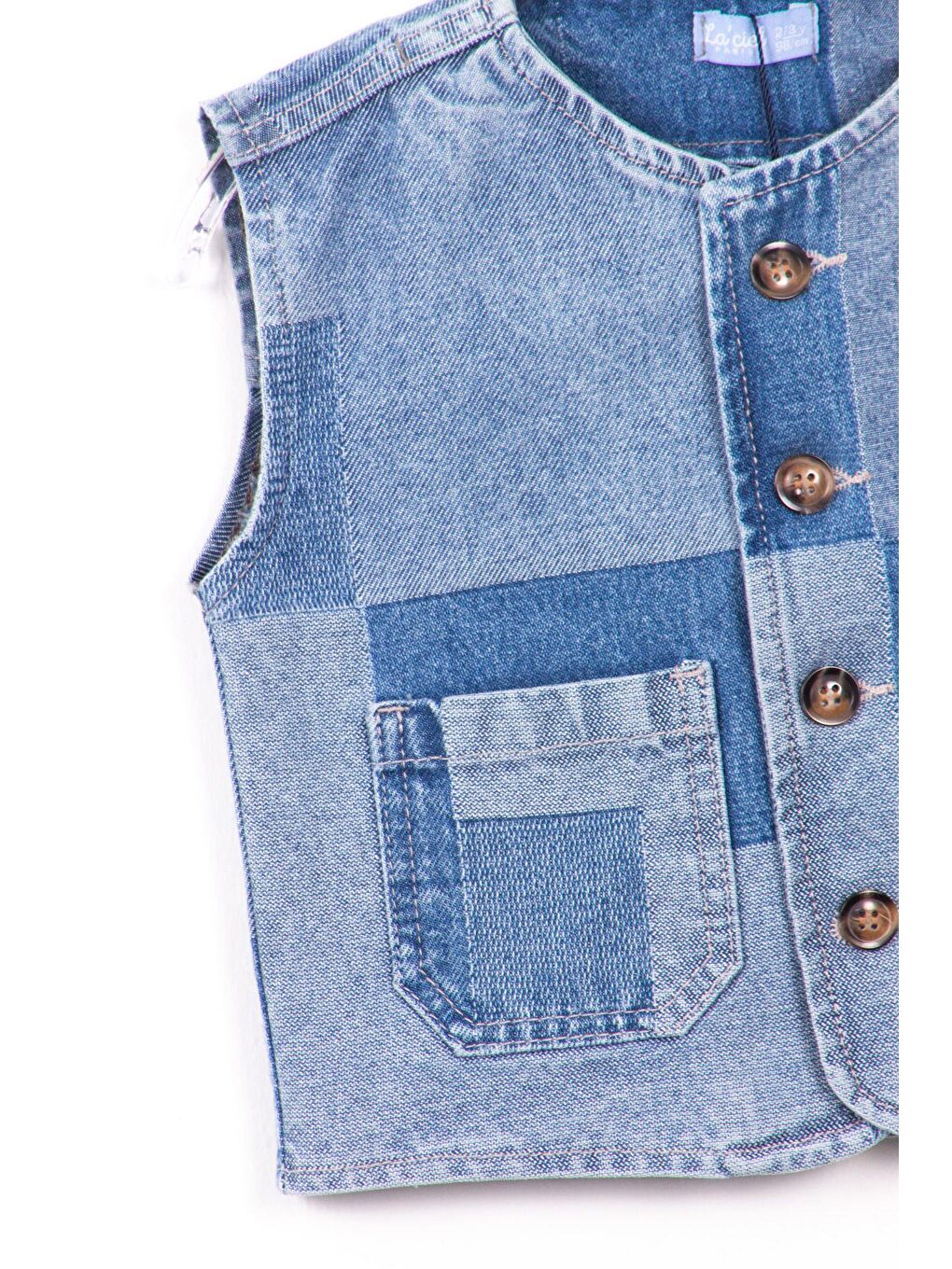 جلیقه جین بچگانه طرح دار آبی نخی – مدل جیب و دکمه دار