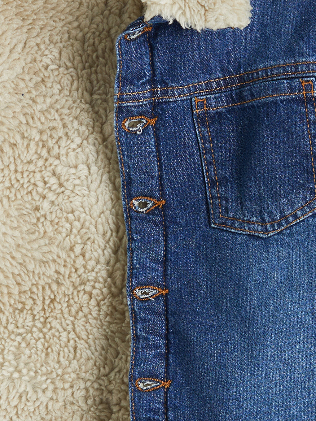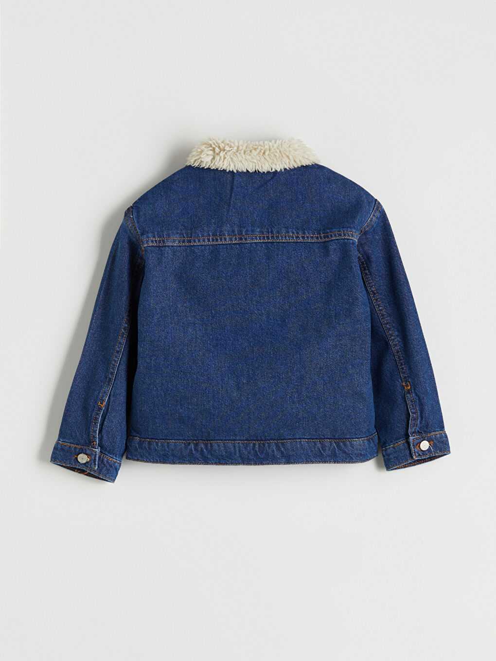 کت پسرانه از پارچه جین. بسته شدن دکمه و یقه خز.