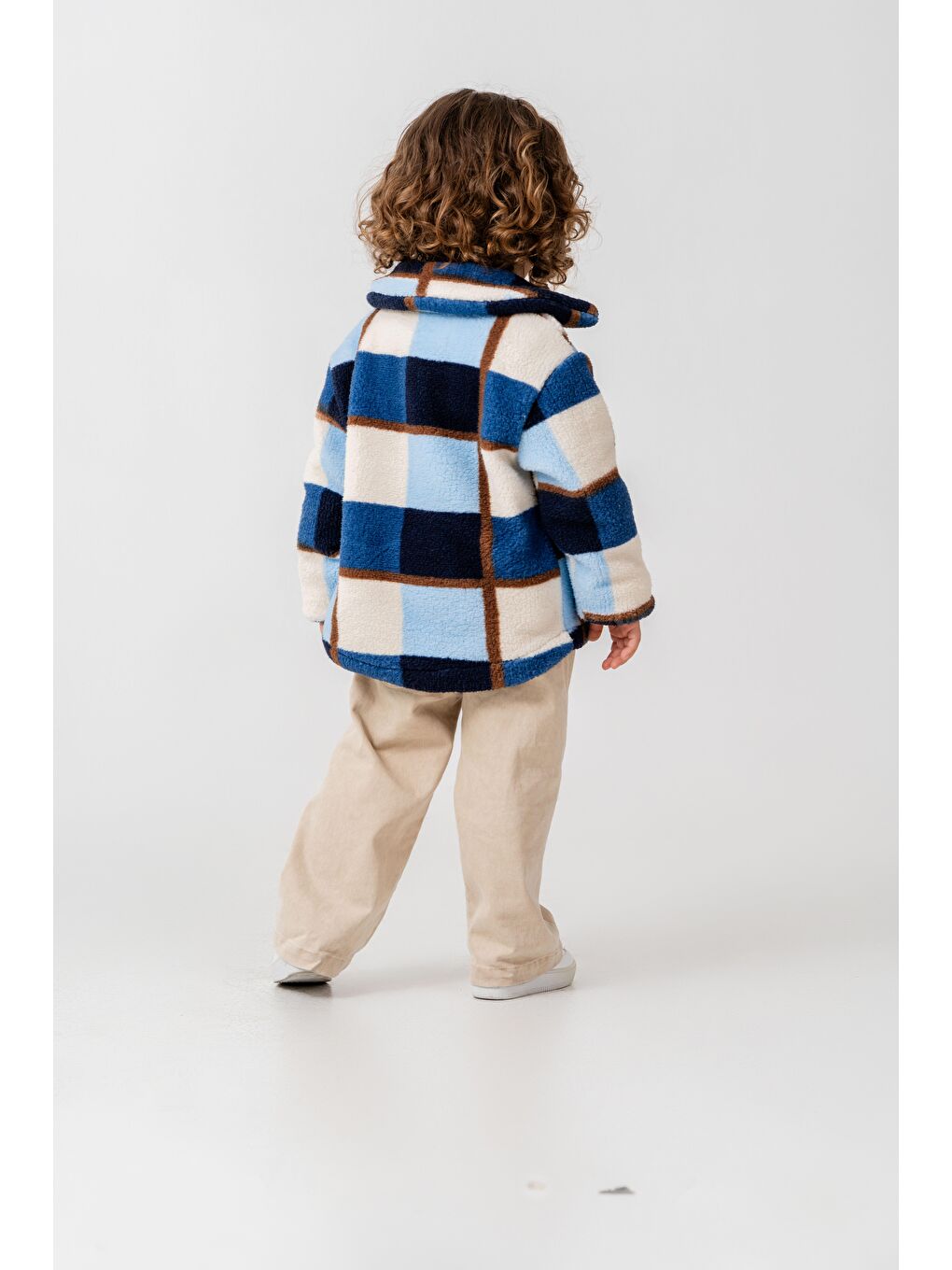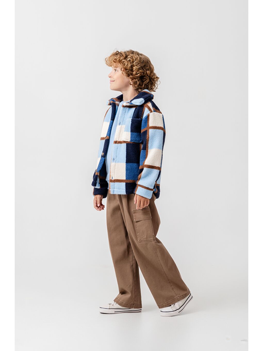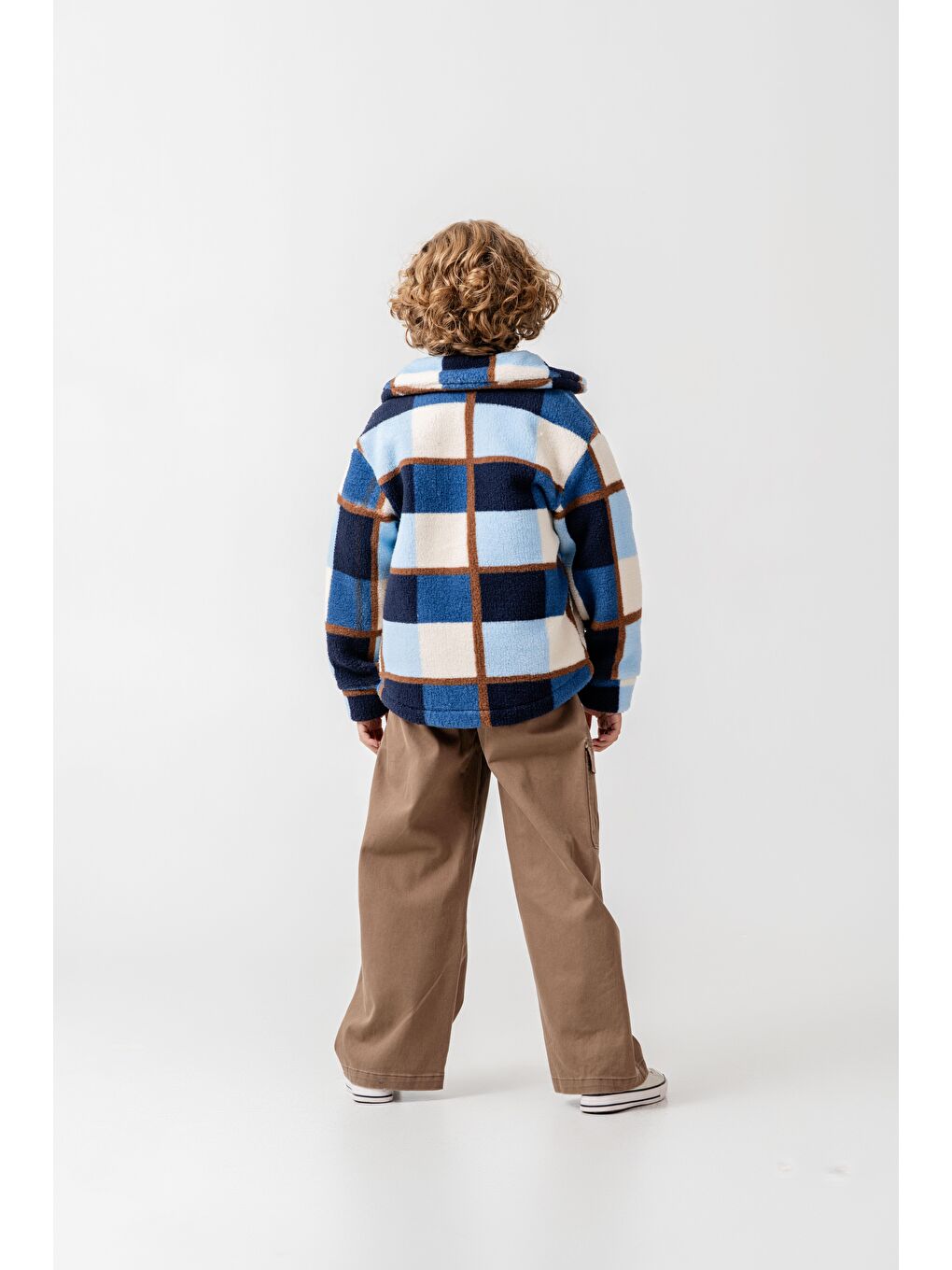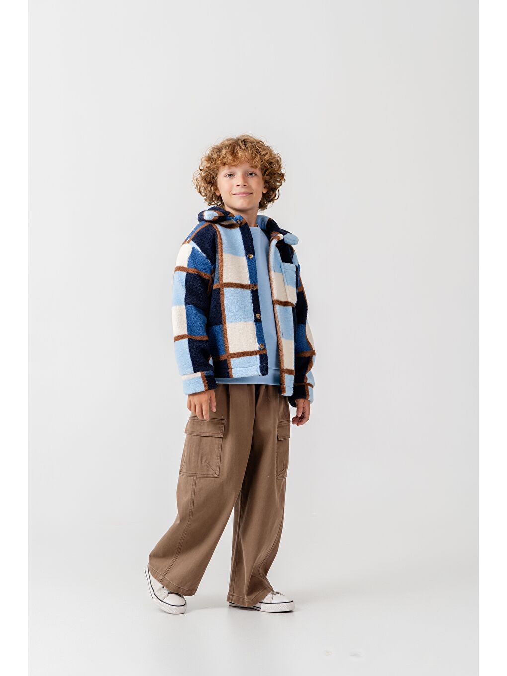 کاپشن پشمی طرحدار چهارخانه آبی نخی پسرانه – جیب و دکمه
