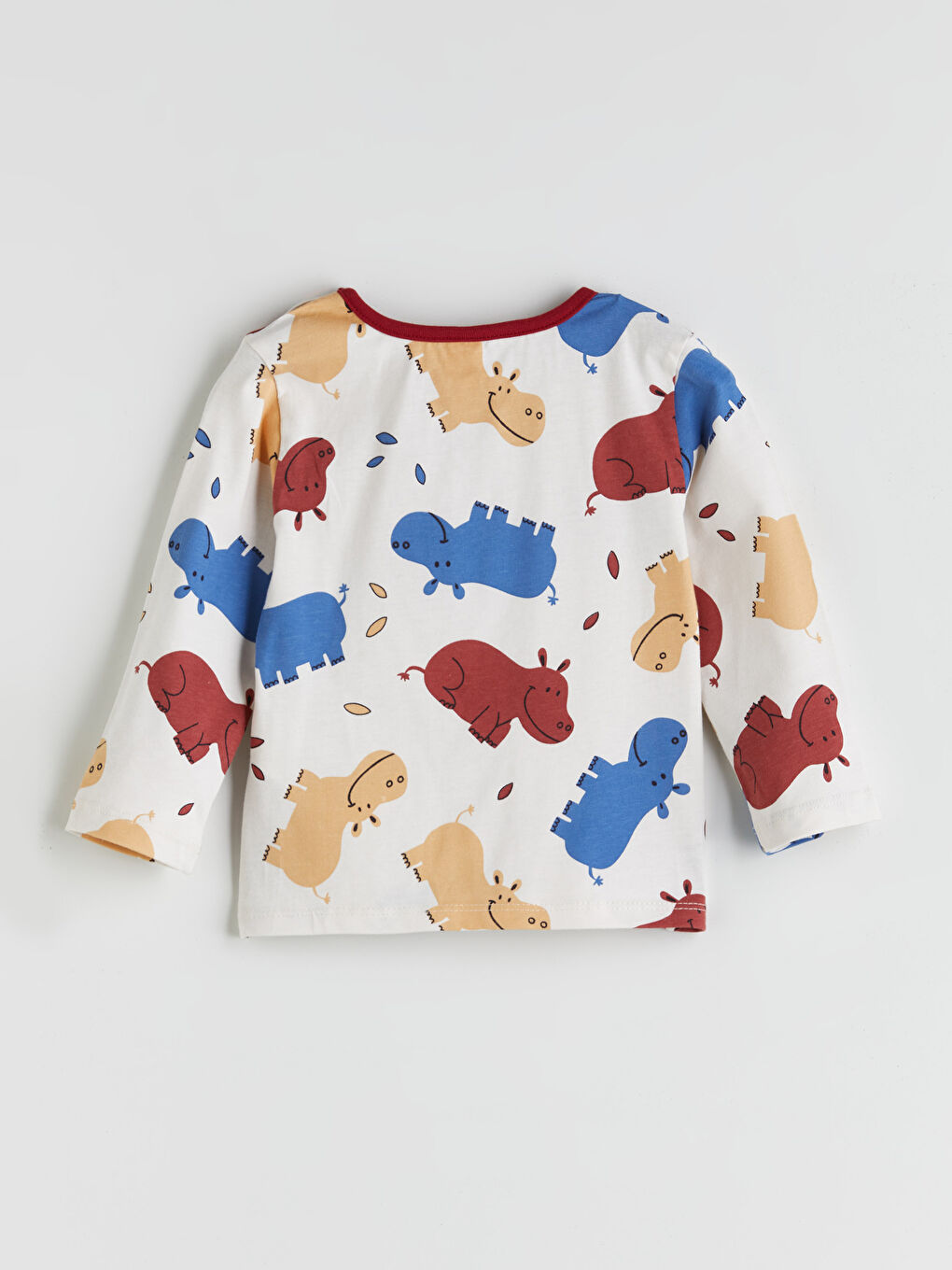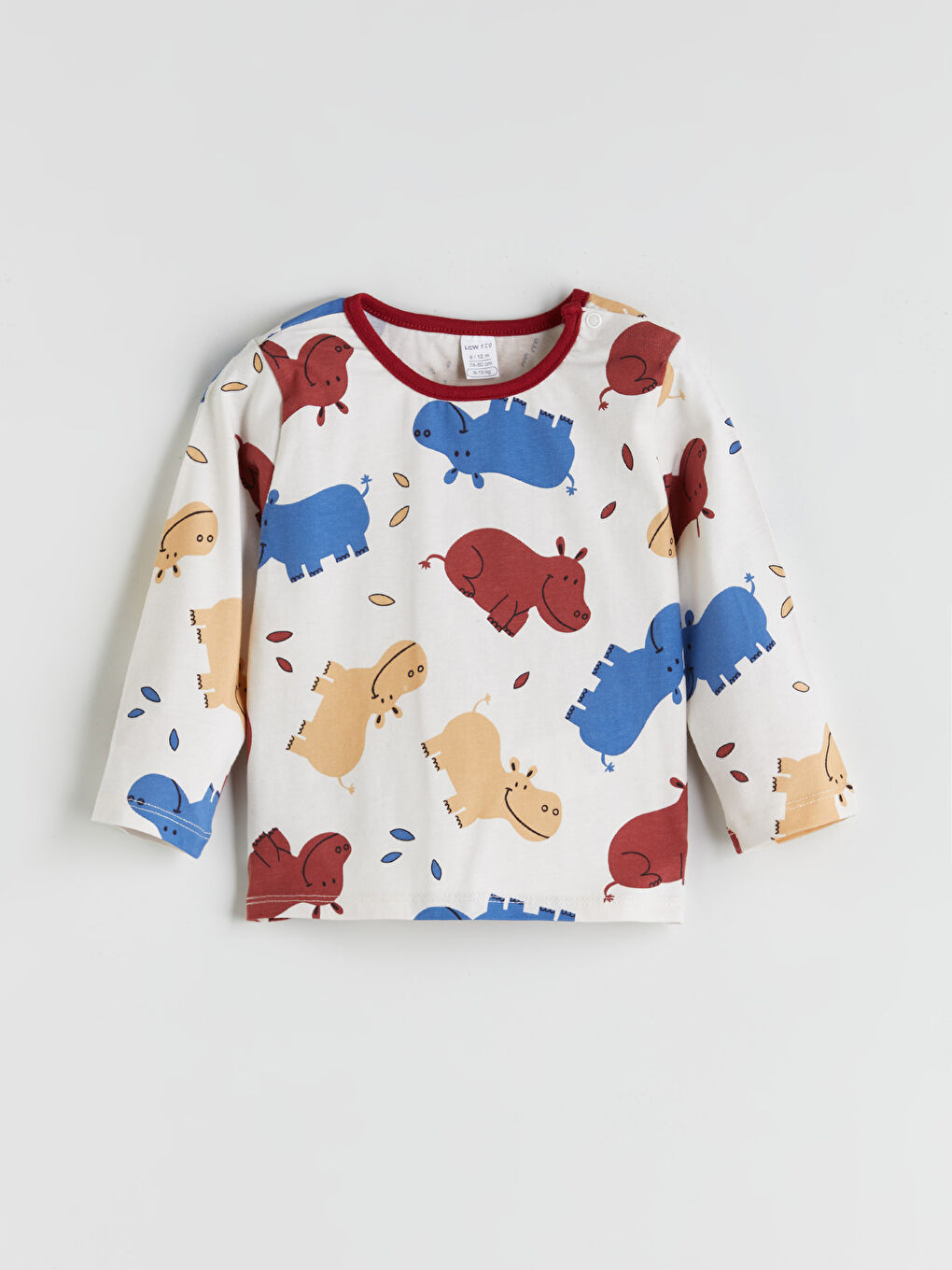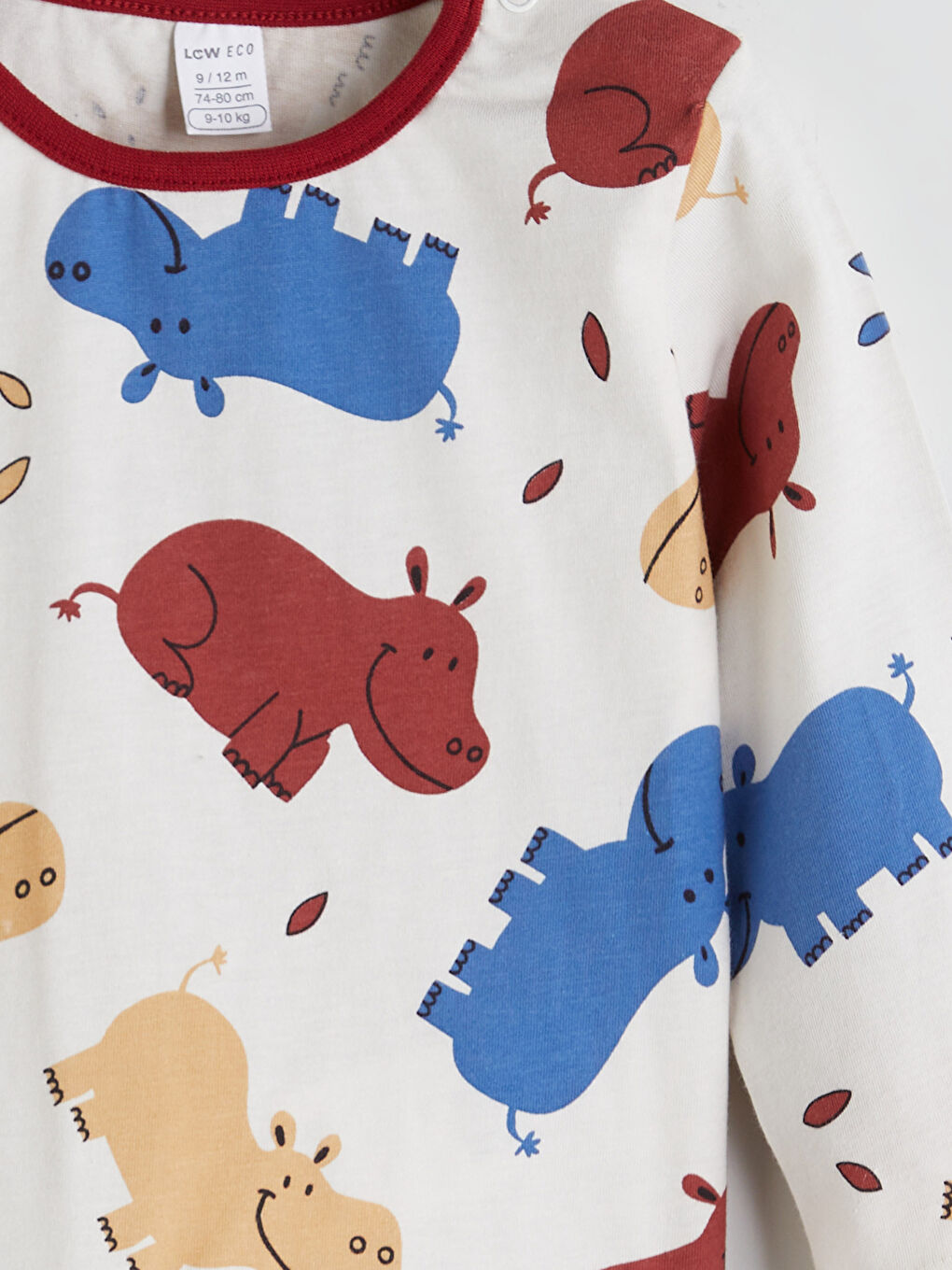 ست لباس خواب نوزادی پسرانه یقه خدمه و بسته شدن شانه از یک تاپ آستین بلند طرح دار اسب آبی و یک تکه پایین ساده تشکیل شده است.