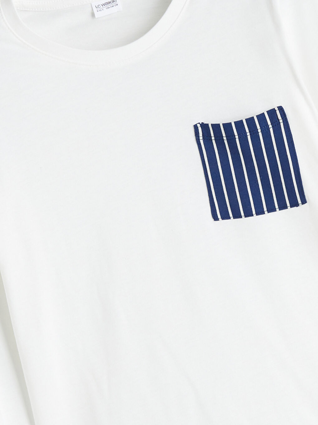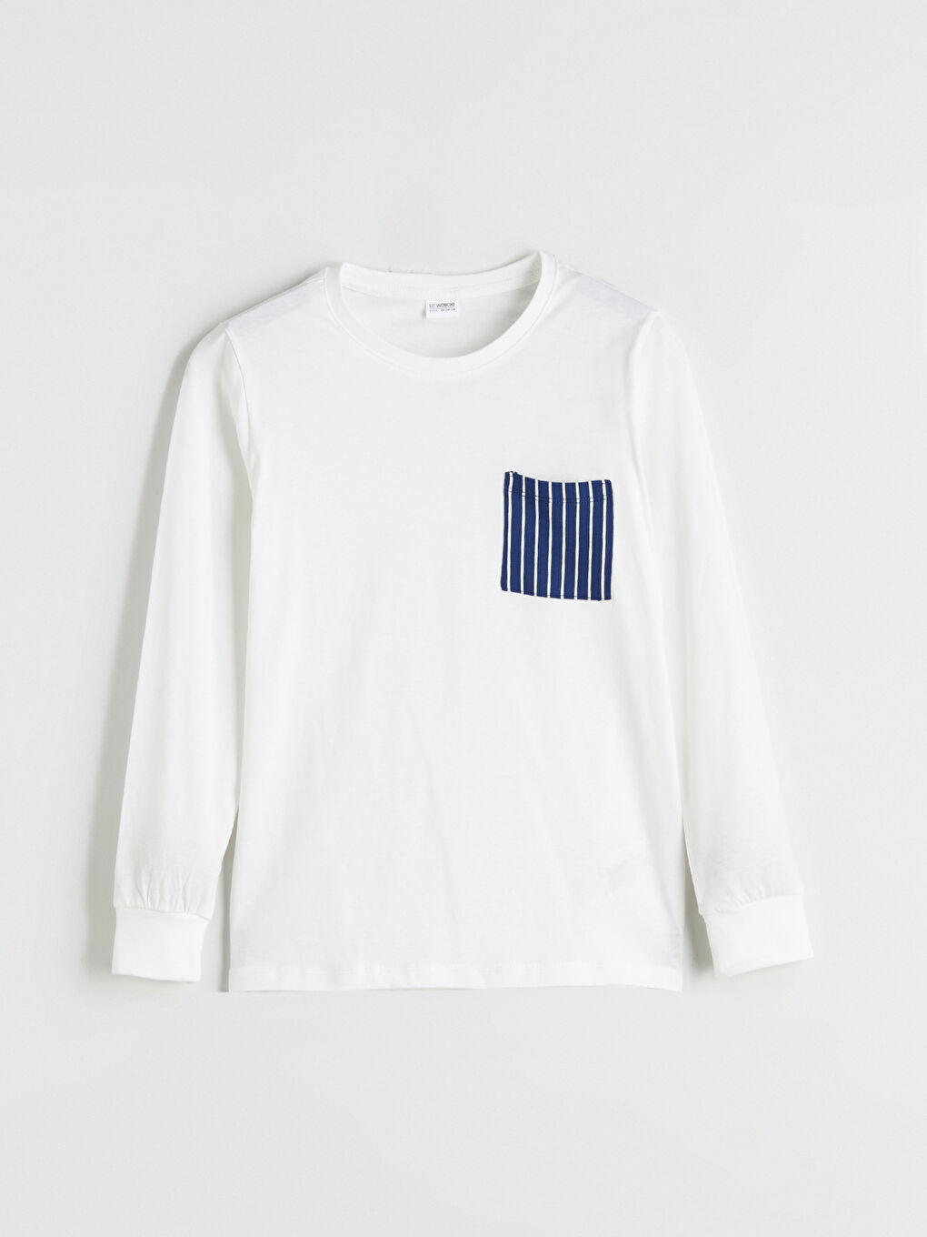 ست لباس خواب پسرانه متشکل از یقه خدمه، آستین بلند، تاپ تک جیب و ته طرح راه راه با لبه های آجدار است. ساخته شده از پارچه 100% پنبه شانه شده.