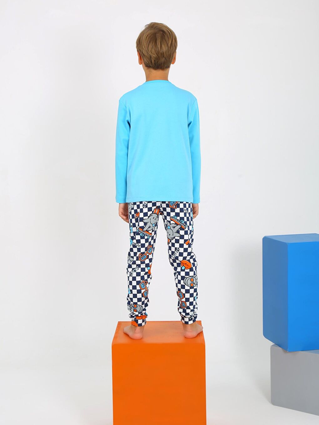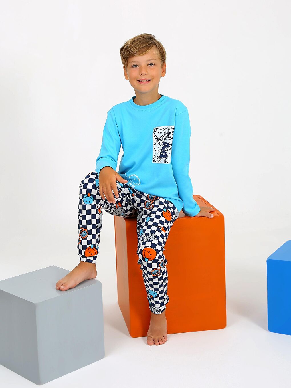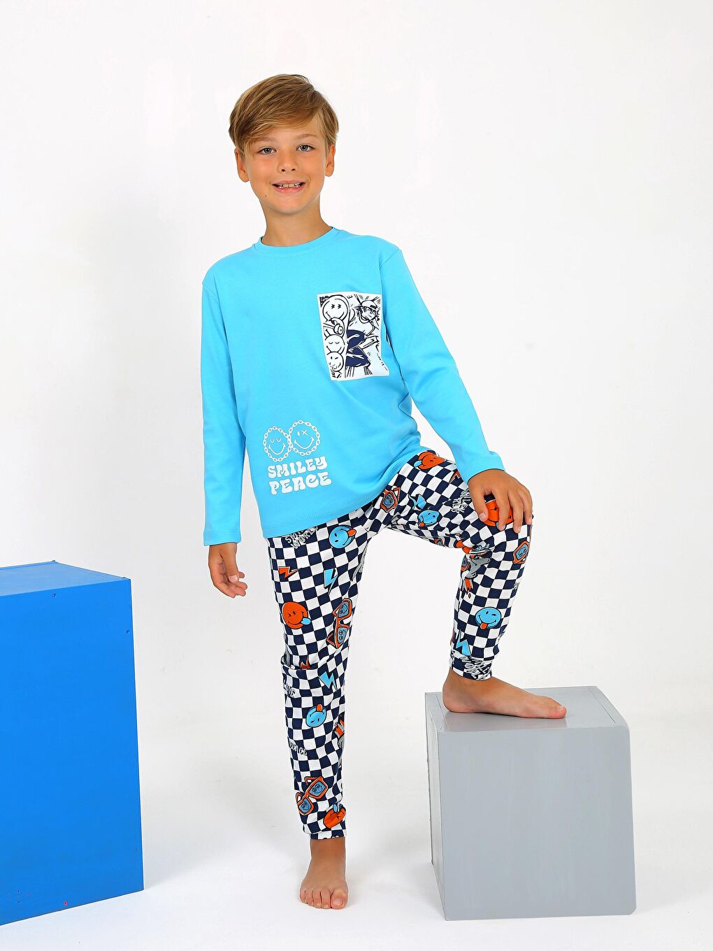 ست لباس خواب آستین بلند پسرانه فیروزه ای 100% نخی Peace