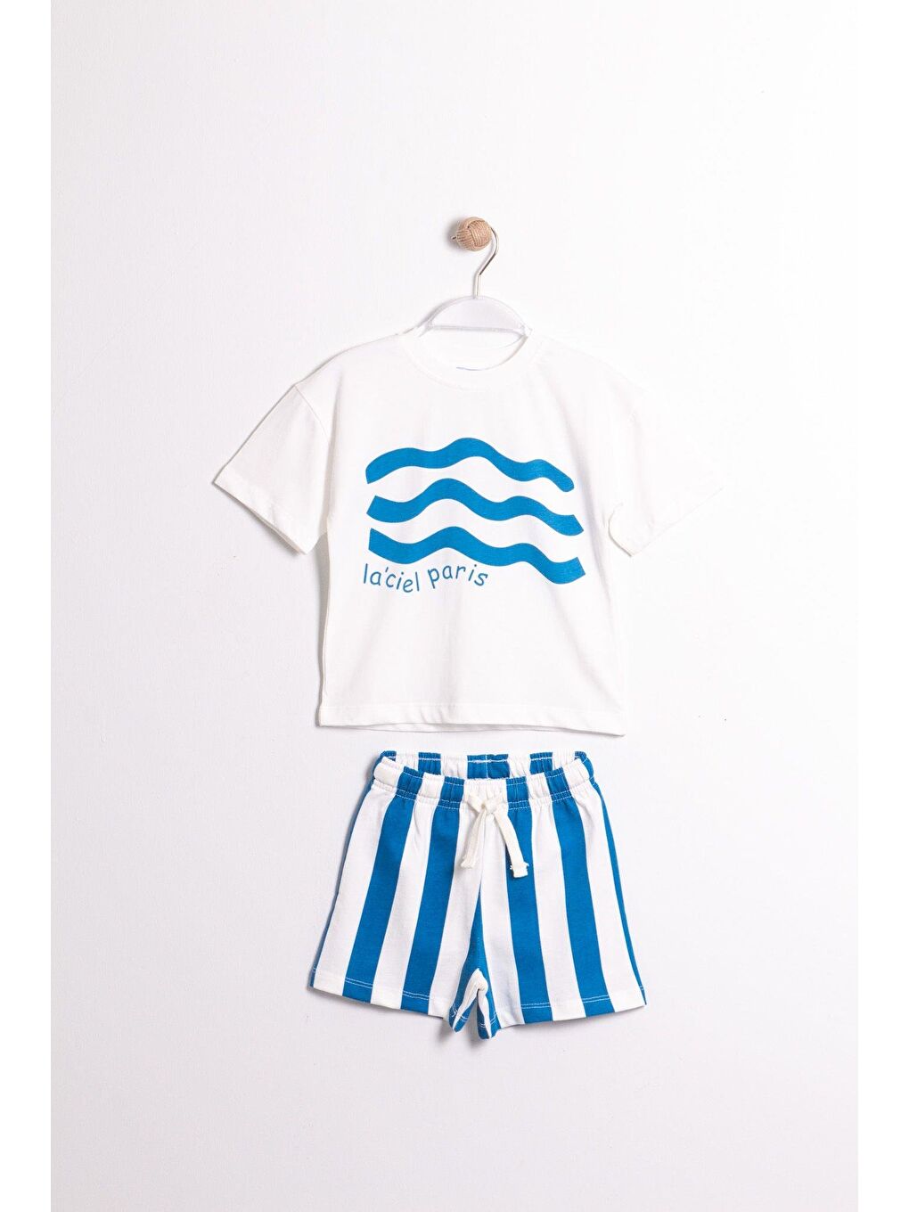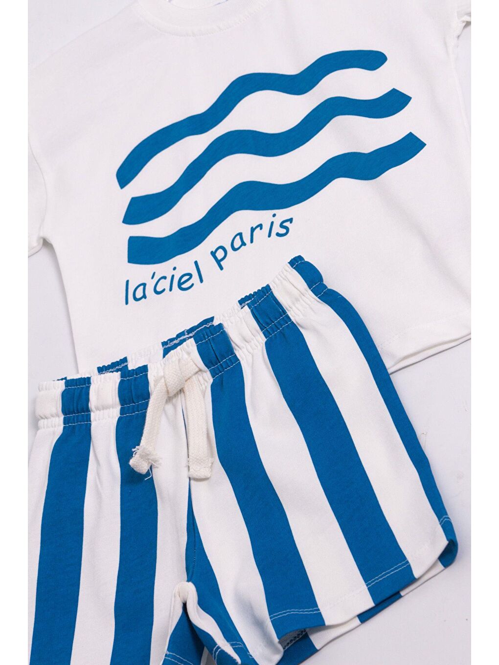 کت و شلوار پسرانه طرح‌دار La’ciel Paris مدل نخی سفید – شلوارک راه‌راه آبی طرح‌دار موج‌دار