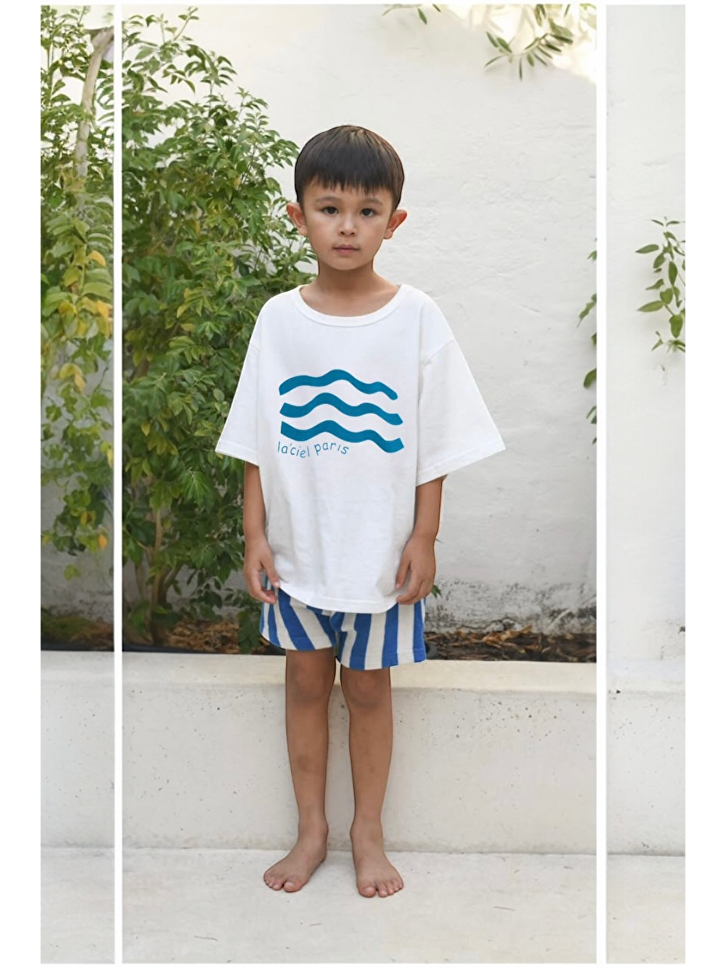 این کت و شلوار راحت پسرانه، کاندیدای محبوب شدن در ماه‌های تابستان است. تی‌شرت سفید، ساخته شده از پارچه ۱۰۰٪ پنبه، با چاپ La Ciel Paris در جلو و الگوی مدرنی که نماد امواج دریا است، تکمیل می‌شود. شلوارک راه راه آبی و سفید که این ترکیب را تکمیل می‌کند، با برش آزاد خود که آزادی حرکت را فراهم می‌کند، راحتی را ارائه می‌دهد. انتخابی عالی برای تعطیلات ساحلی یا استفاده روزانه.