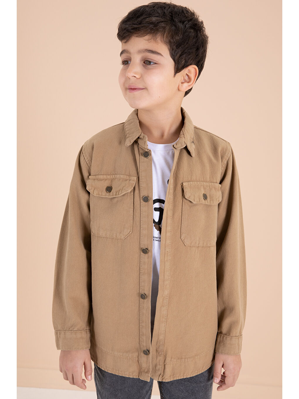 مدل کت و شلوار 3 تیکه پسرانه متشکل از پیراهن کتان آستین بلند با جیب سینه، تی شرت یقه خدمه چاپ شده و شلوار جین با کمر قابل تنظیم.