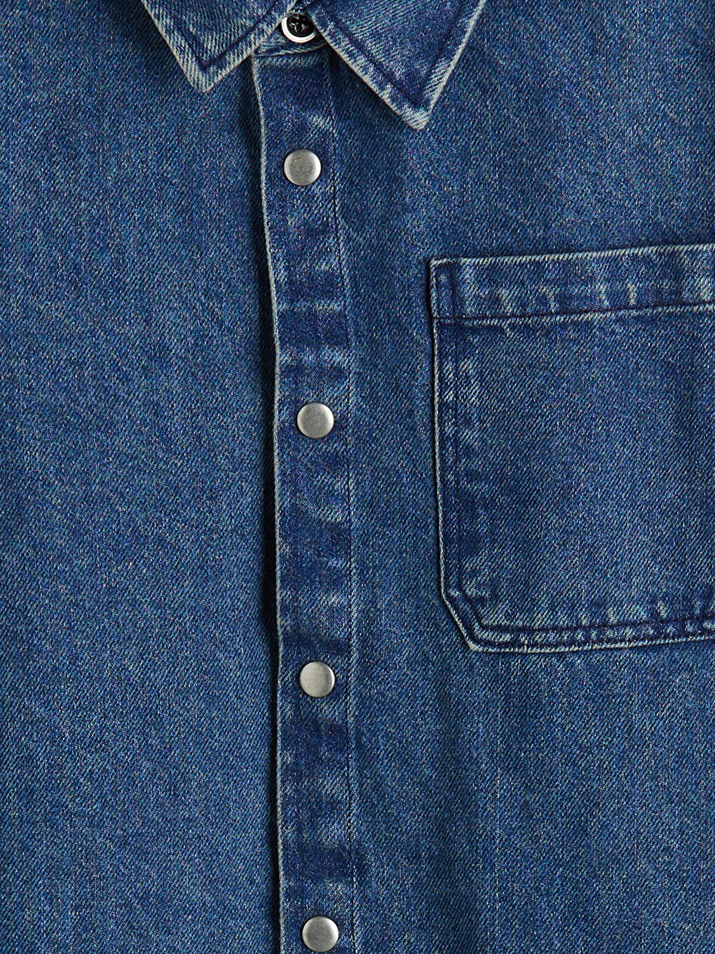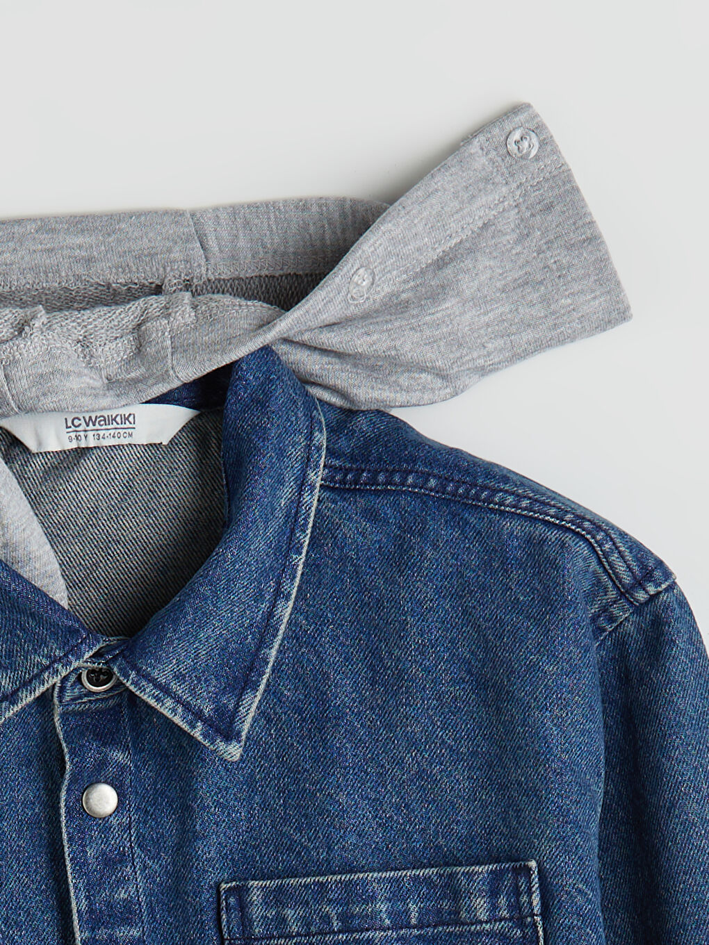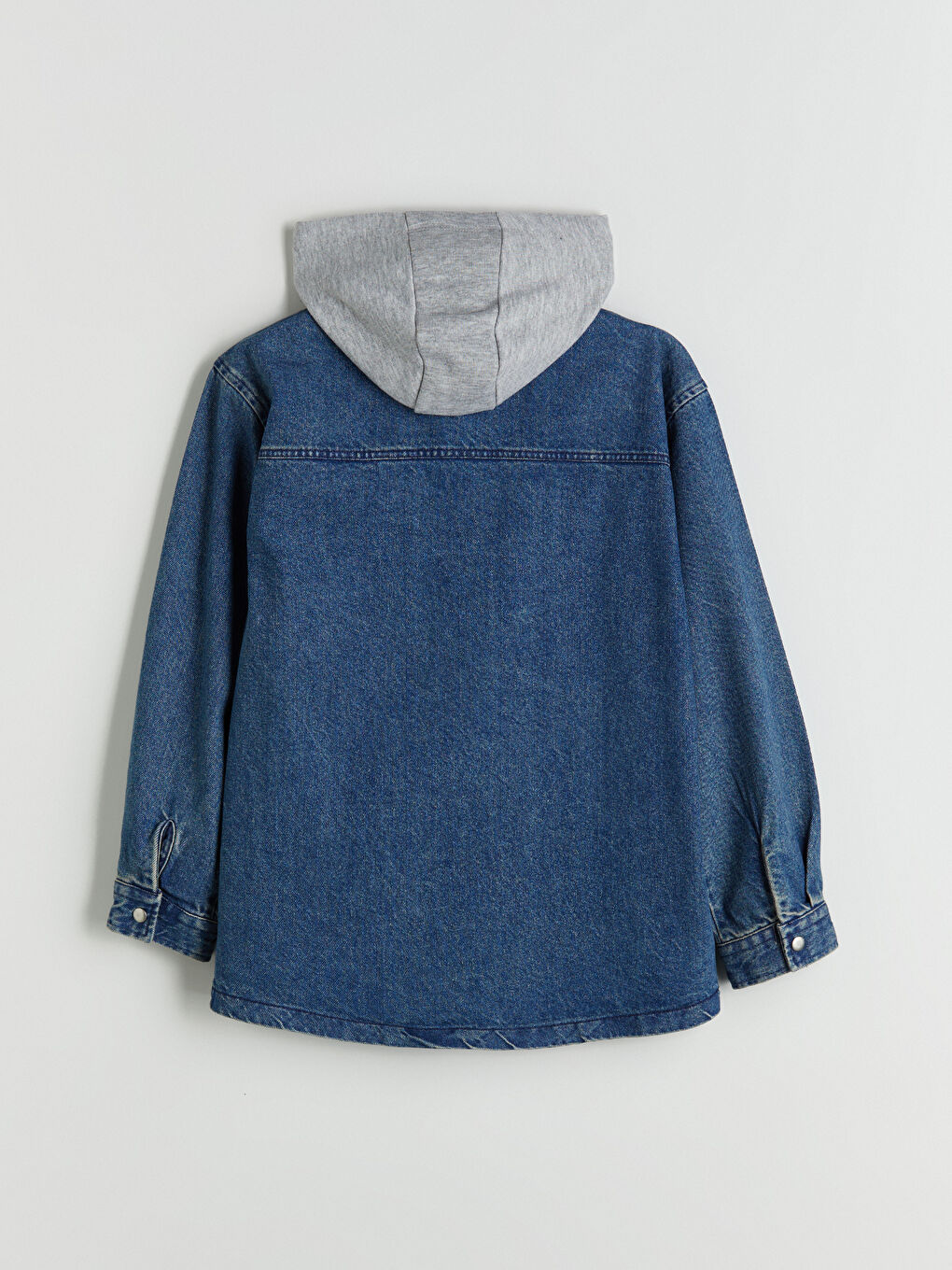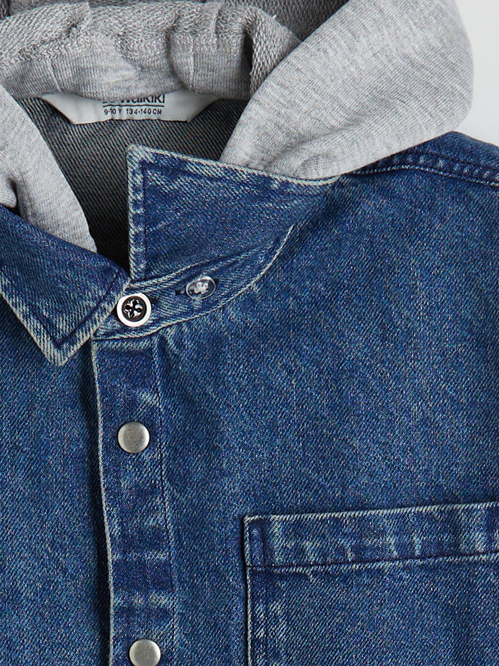 یک پیراهن جین پسرانه یقهدار، کلاهدار، آستینبلند با بسته شدن محکم در جلو و یک جیب روی سینه.