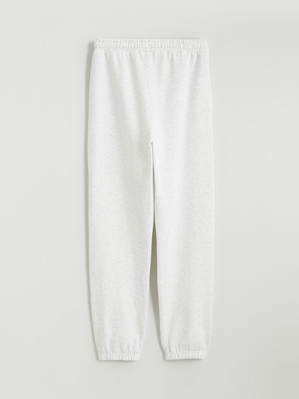 شلوار ورزشی پسرانه با کمر کشی و بند قابل تنظیم، سرآستینهای کشی و جزئیات چاپی، از پارچه ضخیم سه نخ برجسته ساخته شده است.