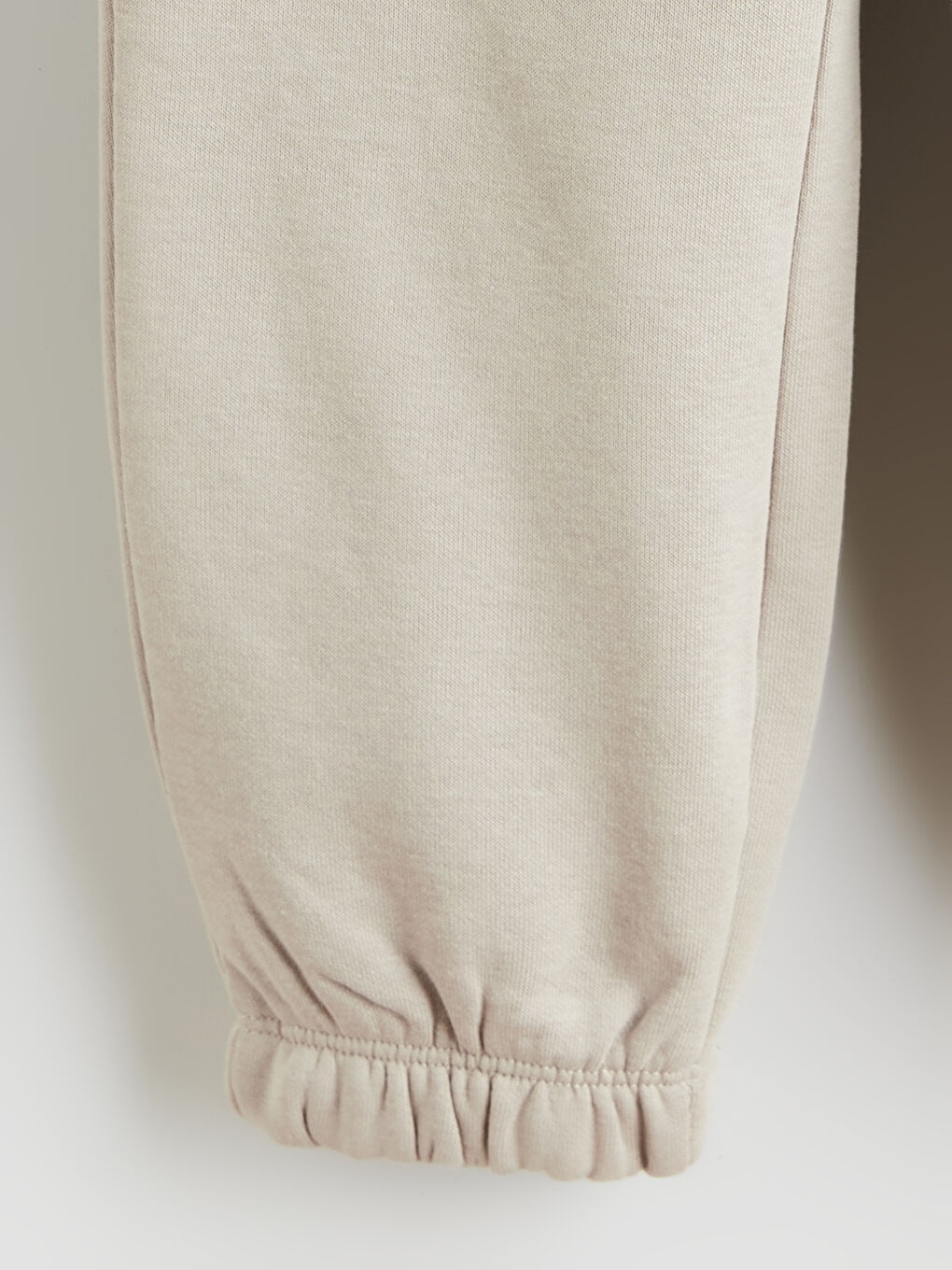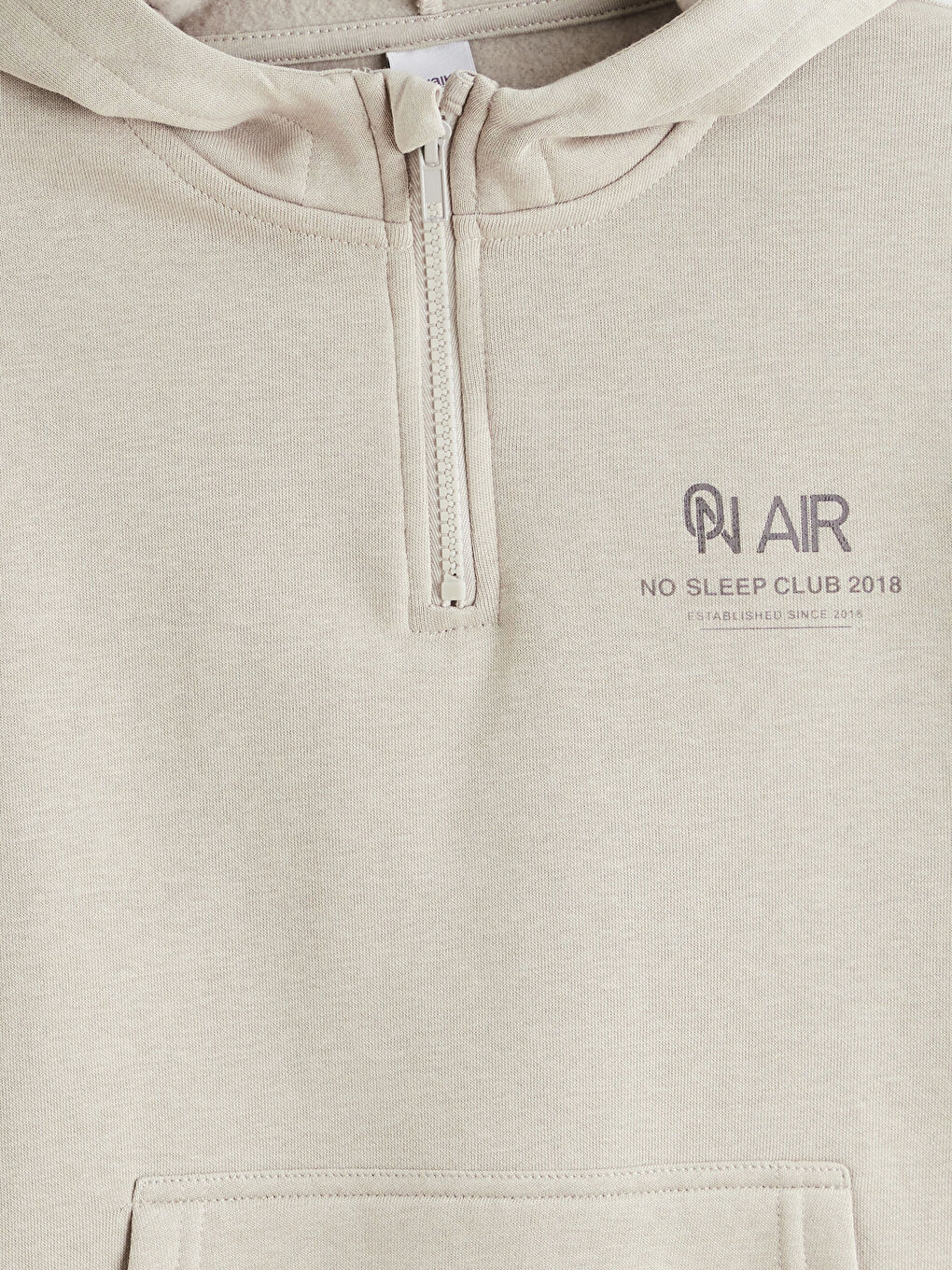 این کت و شلوار پسرانه از پارچه سه لایه ساخته شده است. این کت و شلوار شامل یک سویشرت کلاه‌دار با نیم زیپ و یک جیب کانگورویی و شلوار ورزشی با سرآستین‌های کشی است.