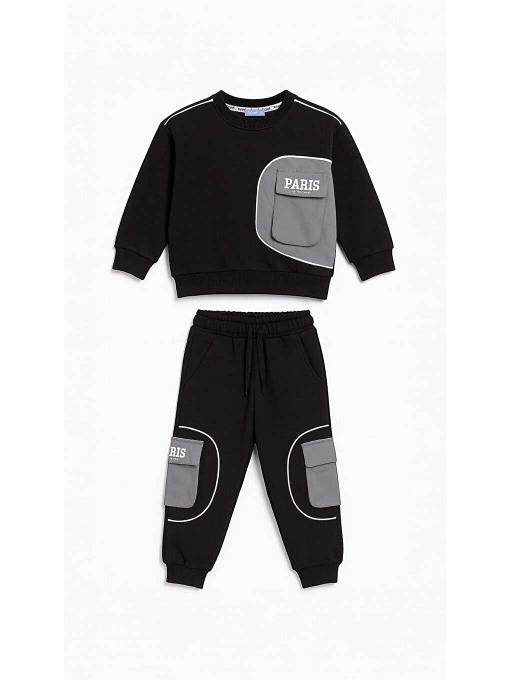 لباس ورزشی طرحدار پسرانه طرح پاریس، طرح نخی مشکی خاکستری – ست دو تکه مدرن
