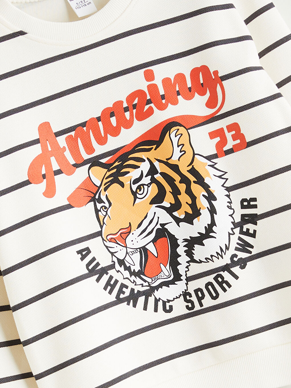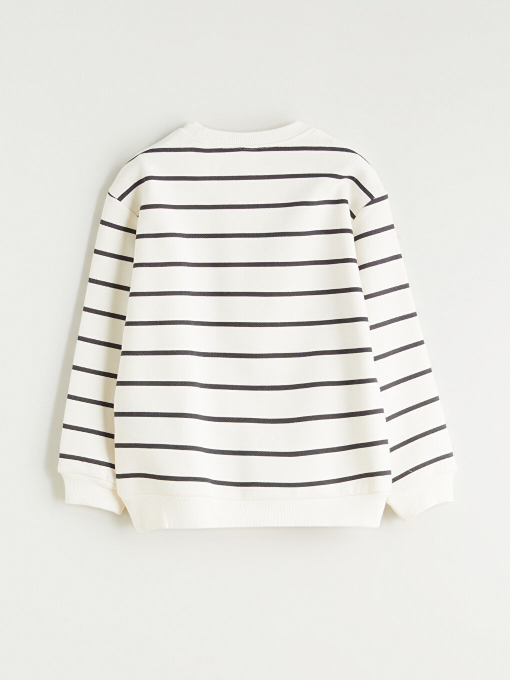 این سویشرت پسرانه از پارچه پیکه ضخیم و پنبه ای ساخته شده است و دارای یقه خدمه و آستین های بلند است. دارای طرح راه راه و جلوی چاپ شده است.