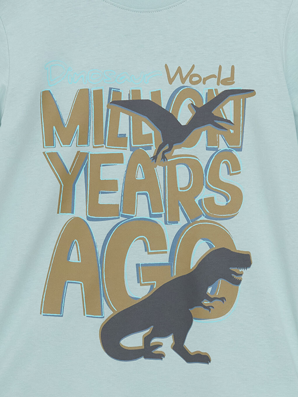 این لباس خواب پسرانه با یقه خدمه، آستین کوتاه دارای یک دایناسور و چاپ متن در جلو است.