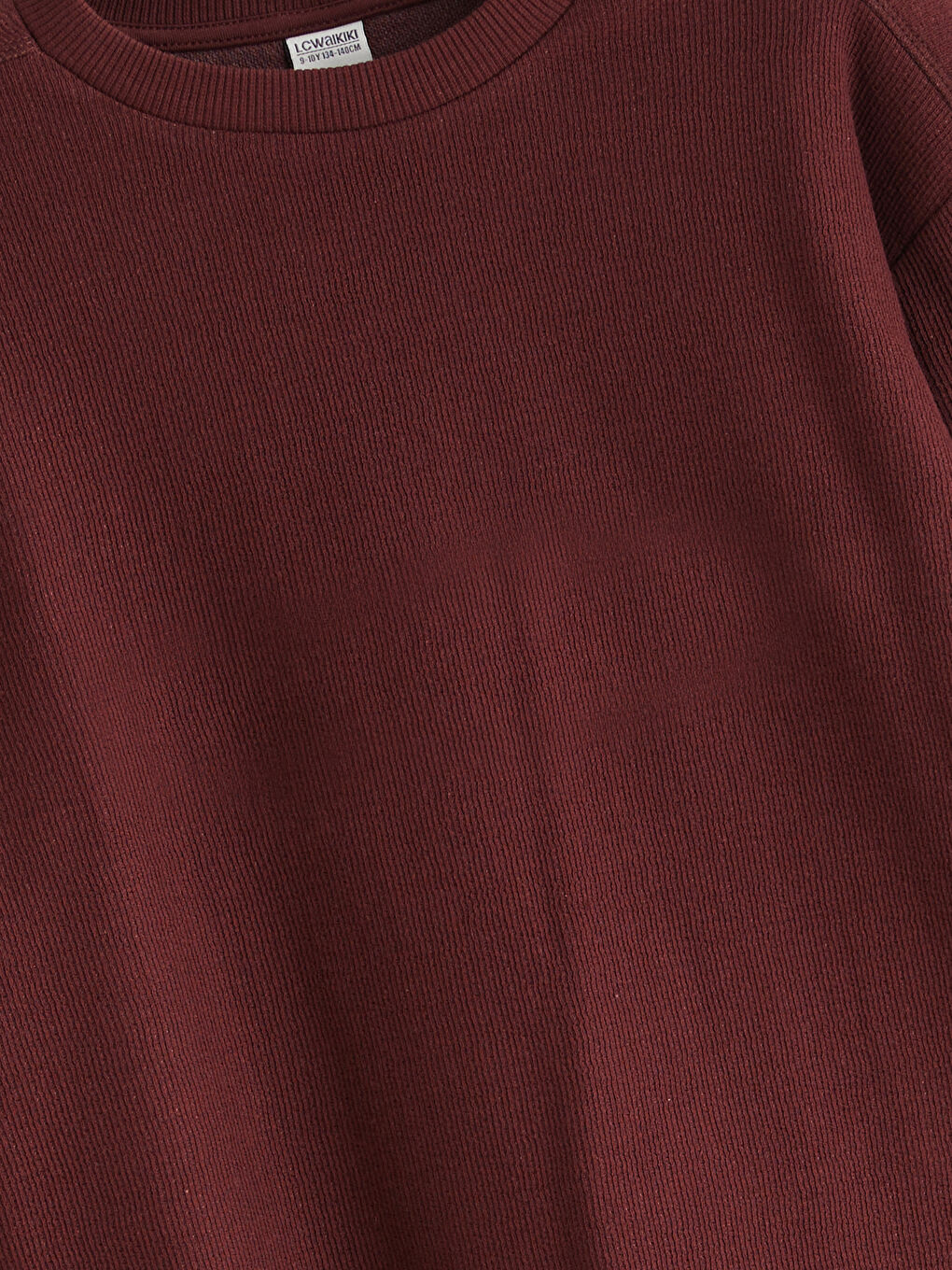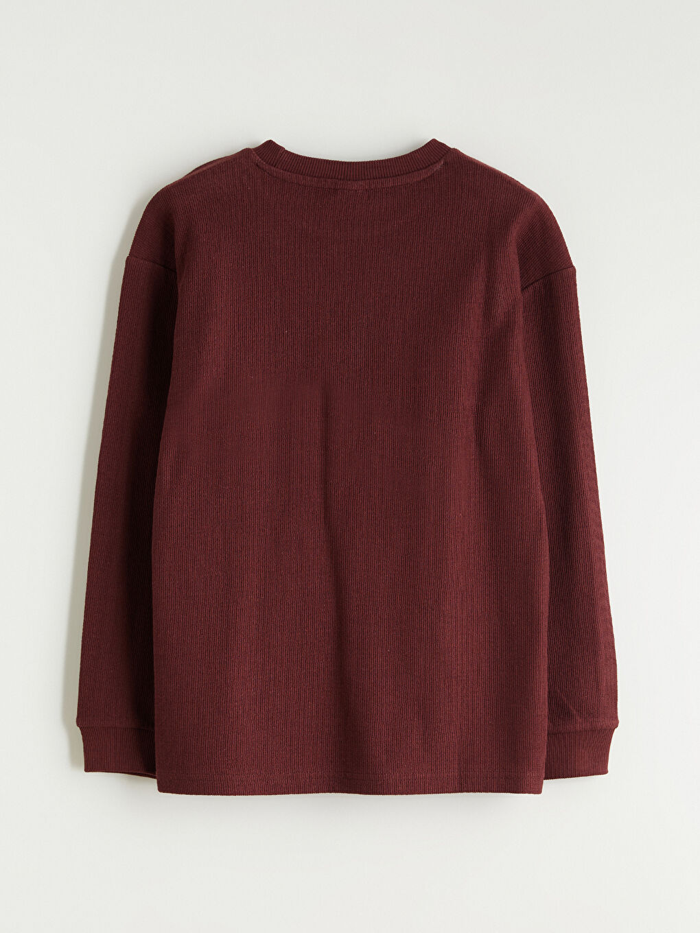 این تی شرت پسرانه دارای یقه خدمه و آستین بلند است. از پارچه وافل ساخته شده و حالت گشادی دارد.