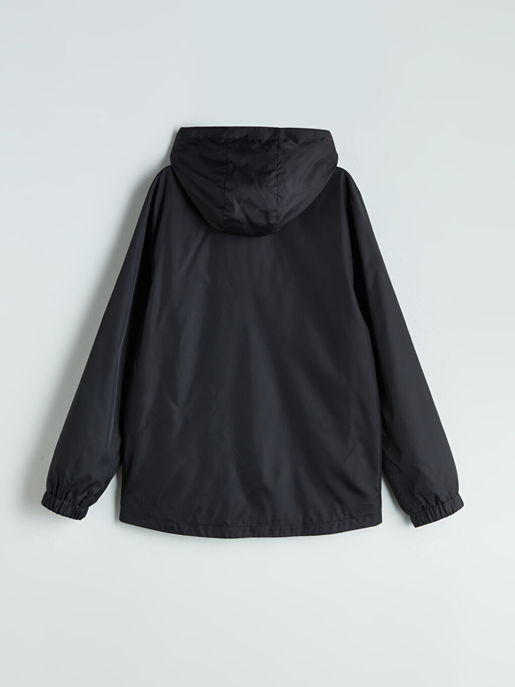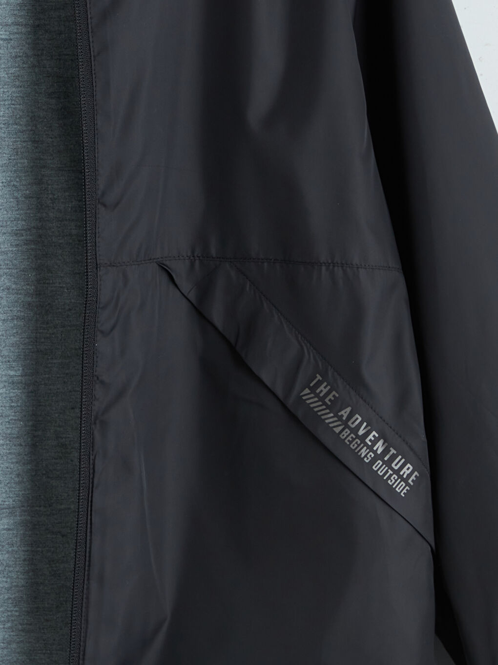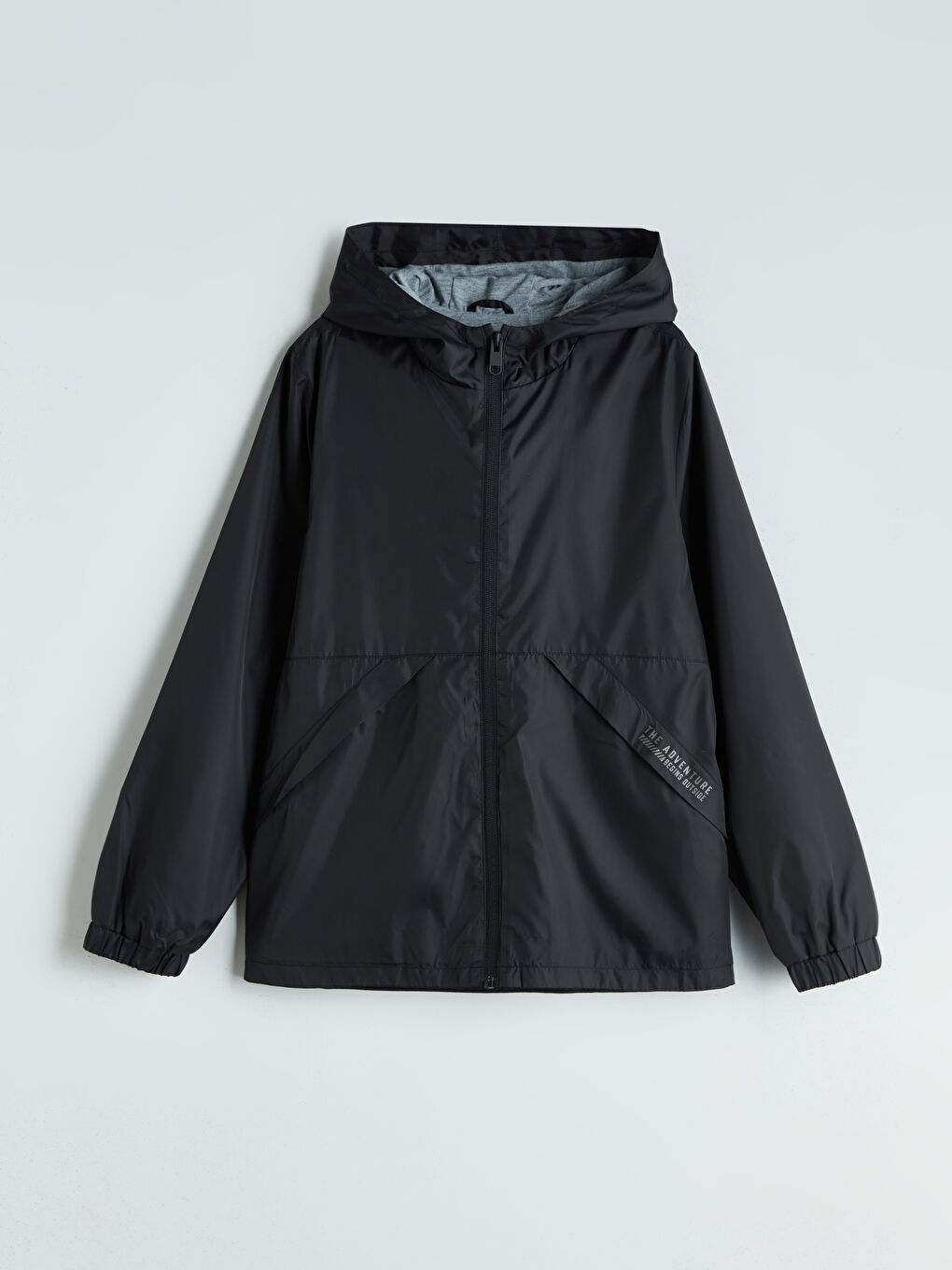 این کت بارانی پسرانه دارای طراحی سرپوش، زیپ دار، جیب و چاپ متن است.