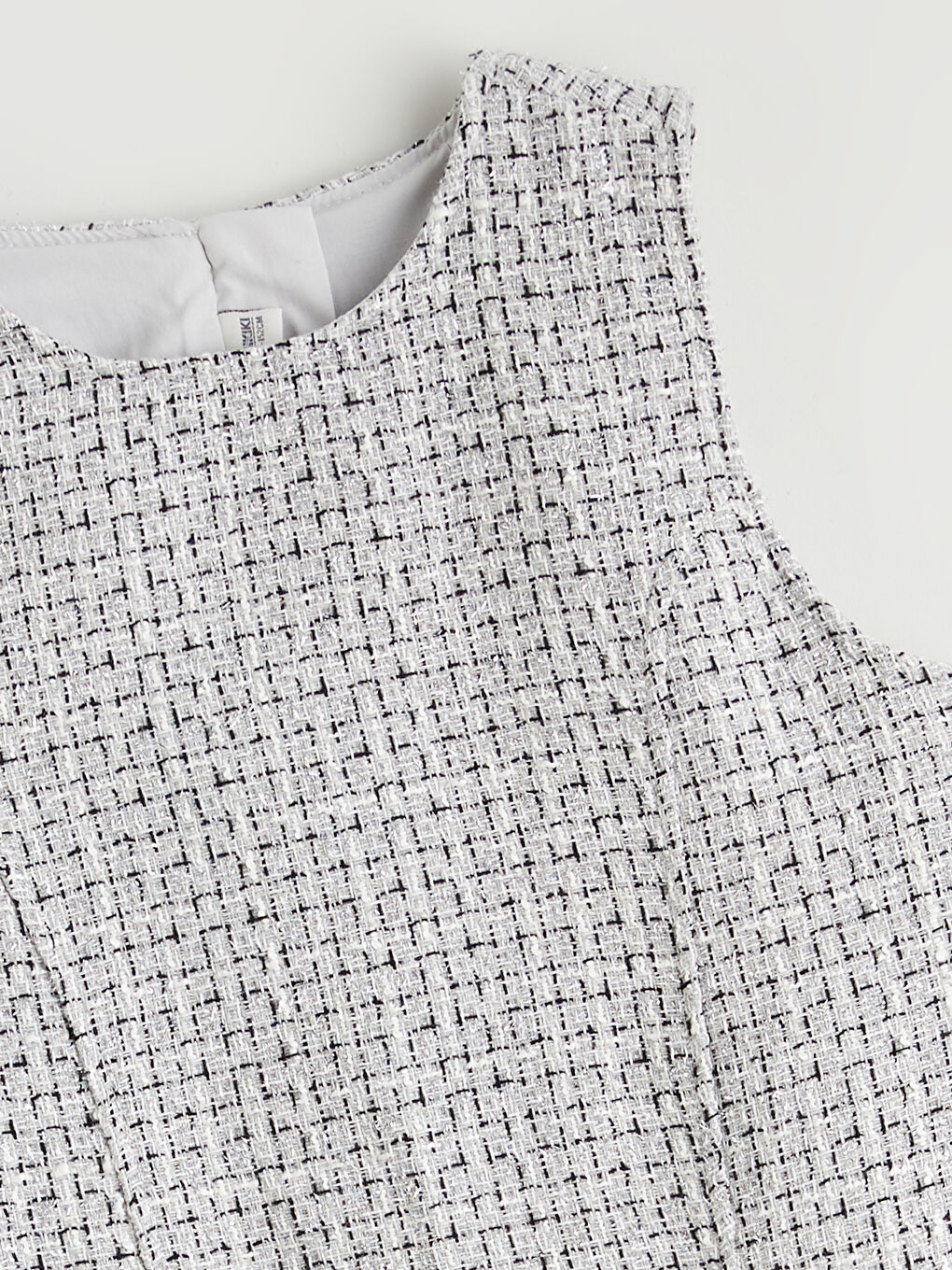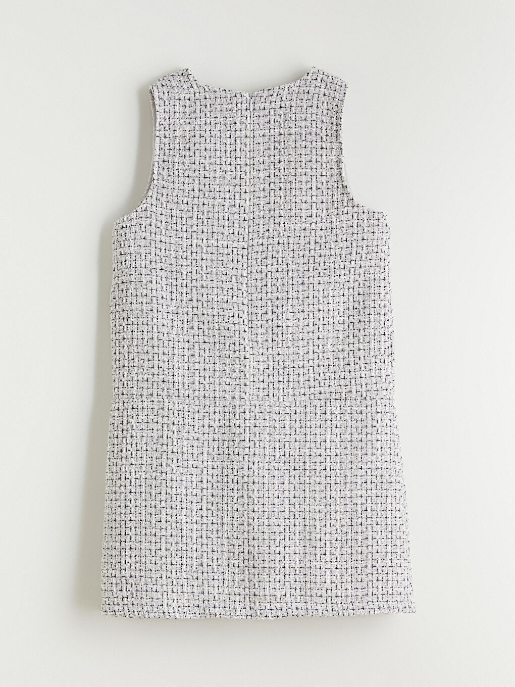این لباس دخترانه بدون آستین و یقه گرد از پارچه تویید دوخته شده است. دارای یک جیب در جلو، لبه چیندار و قد آن تا بالای زانو است.
