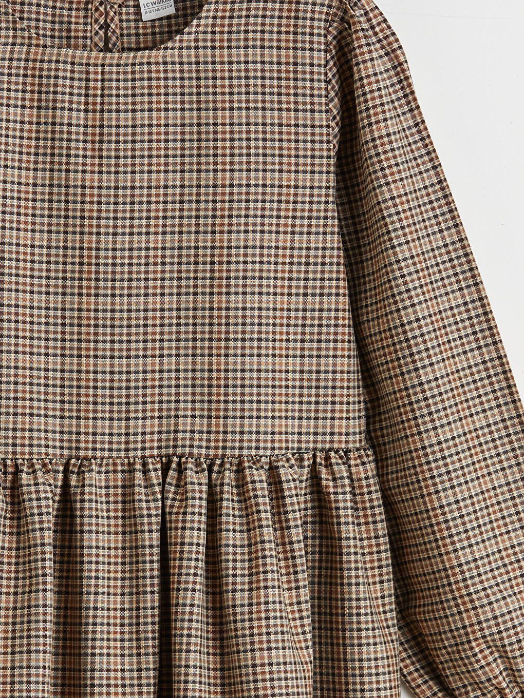 لباس دخترانه یقه گرد طرح چهارخانه، دارای آستینهای بلند و کمر چیندار است. یقه با دکمه بسته میشود.