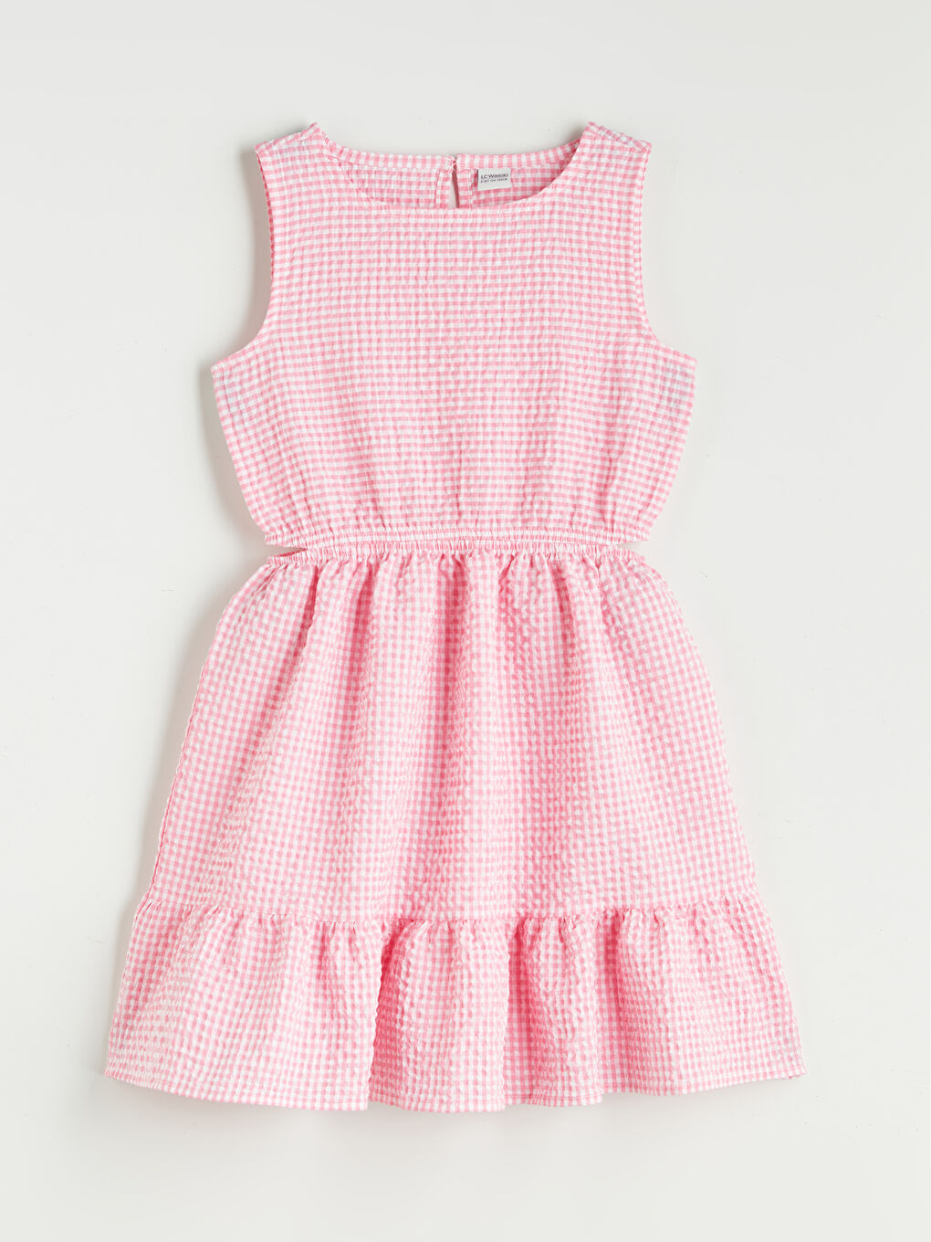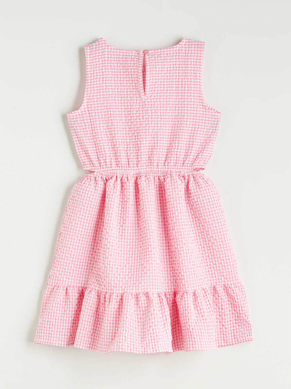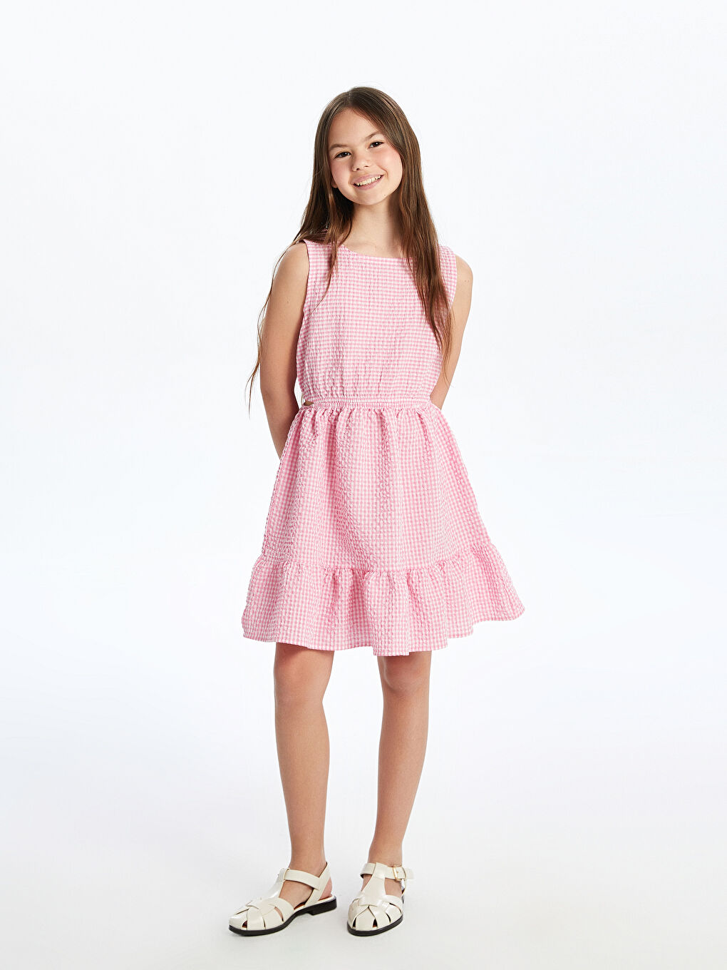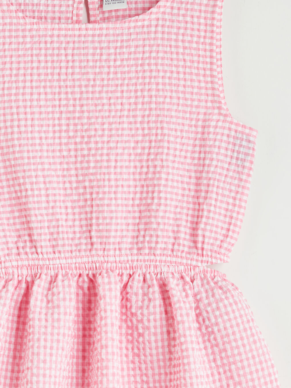 لباس دخترانه طرح دار جنجیمی از پارچه چشمک زن تهیه شده است. دارای یقه خدمه، کمر بدون آستین، الاستیک با پنجره، و لبه‌های شلاقی است.