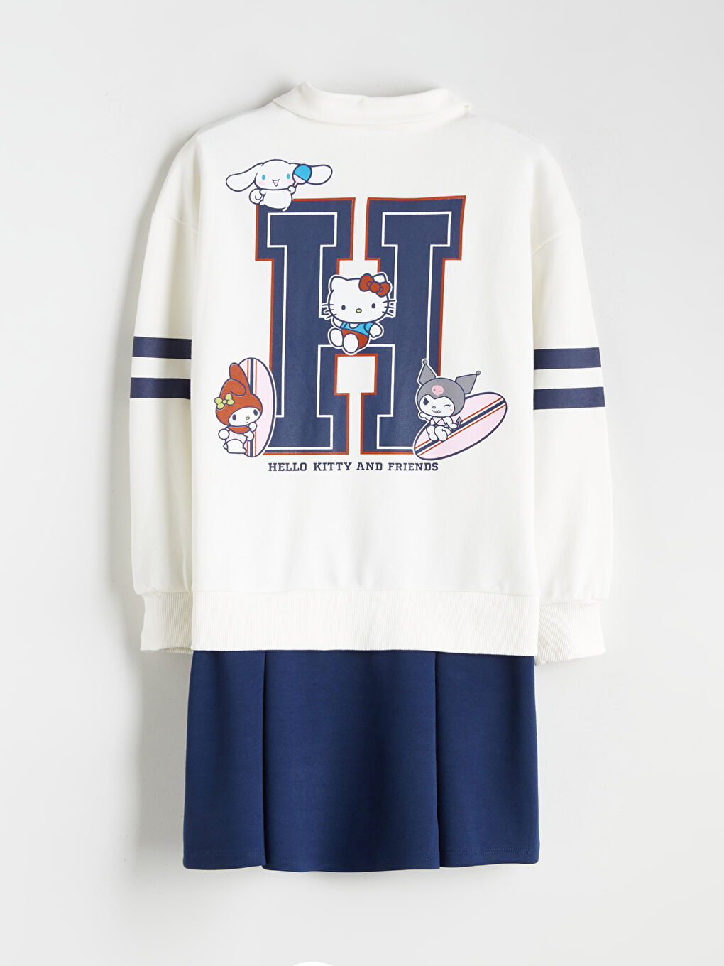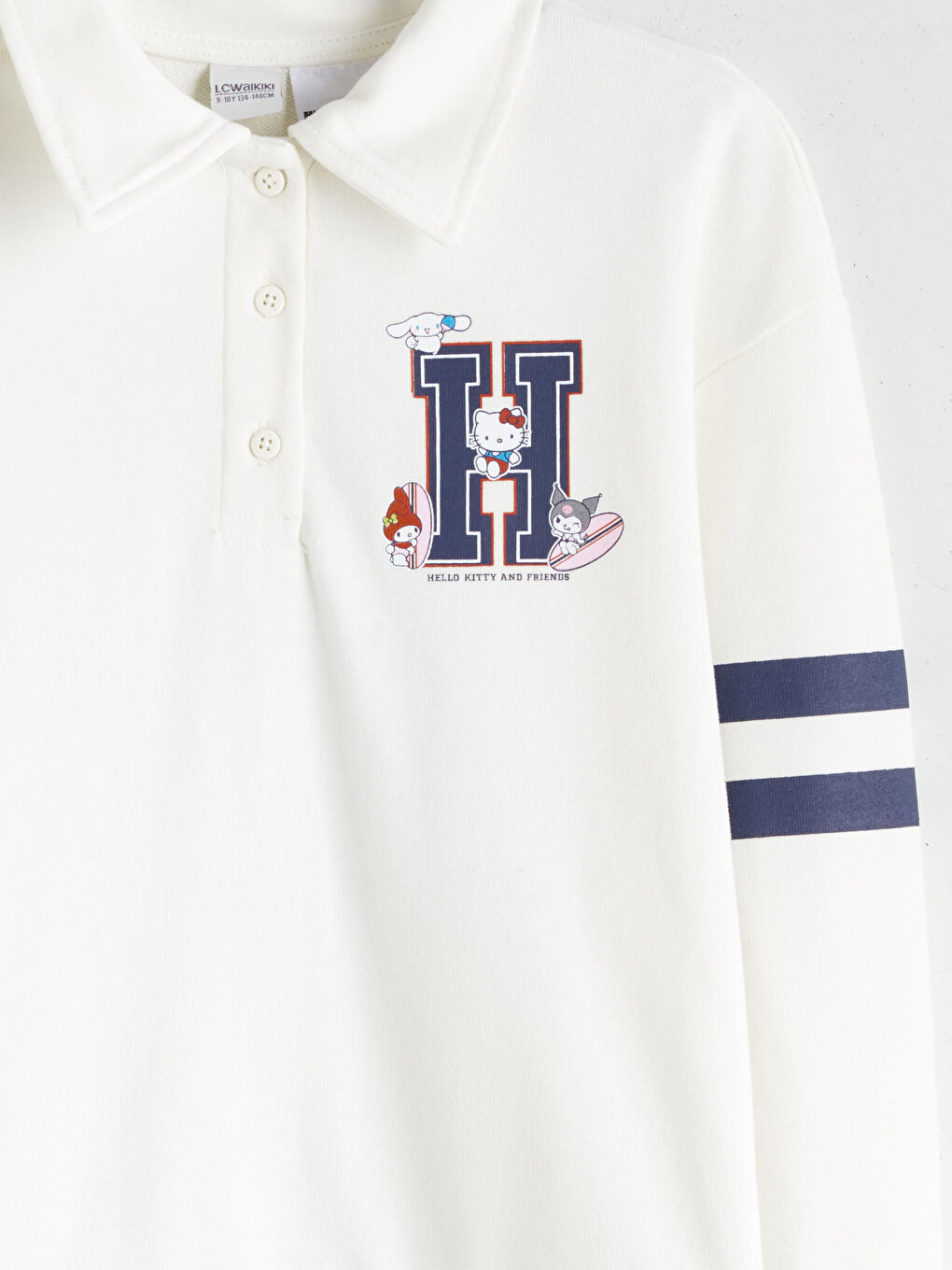 لباس دخترانه دارای مجوز Hello Kitty and Friends دارای یقه پولو و بسته شدن دکمه است. دارای آستین های بلند، سجاف چین دار و بالای زانو است.