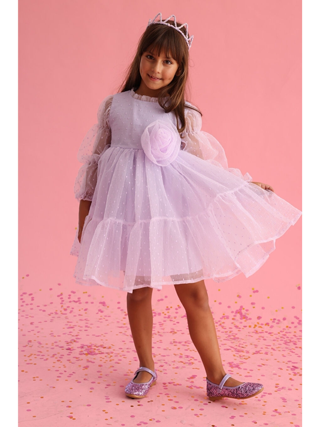 لباس دخترانه یاسی خالدار با اکسسوریهای رز – بلیندا