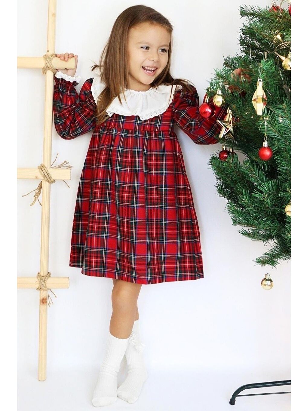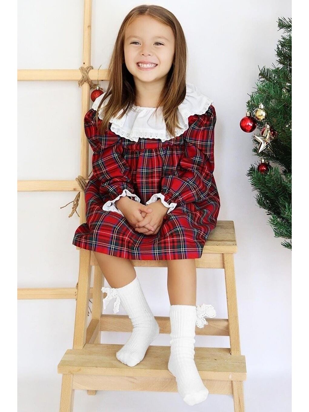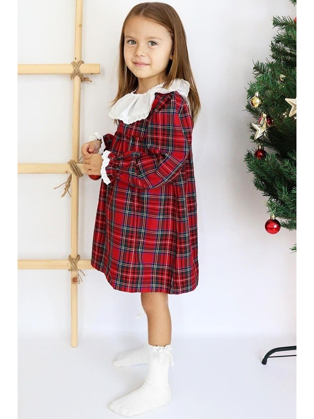 لباس مجلسی دخترانه آستین بلند چهارخانه قرمز طرح توری طرح چیندار جدید