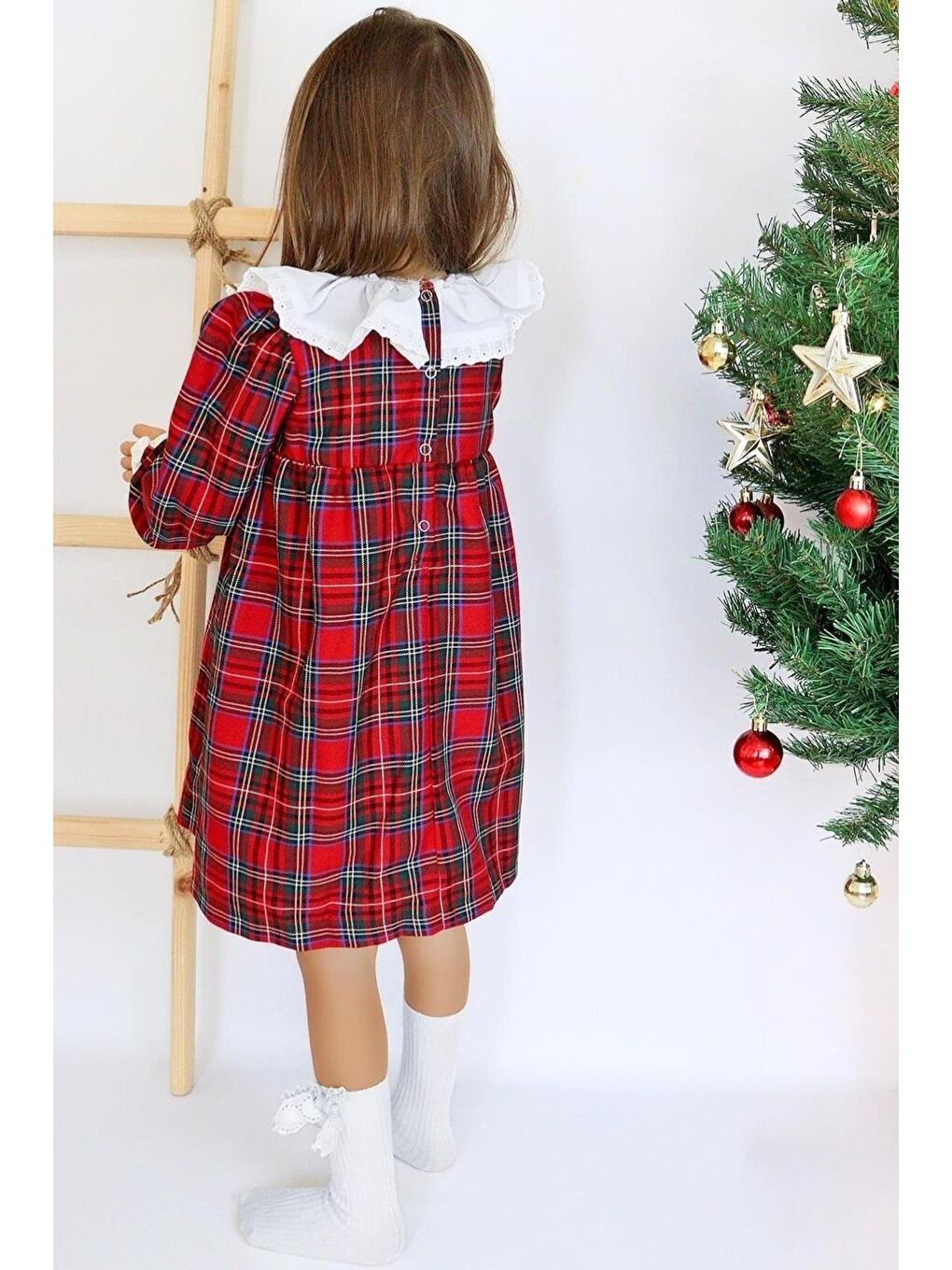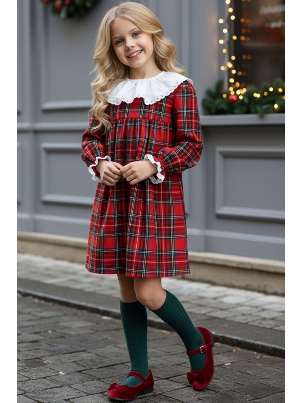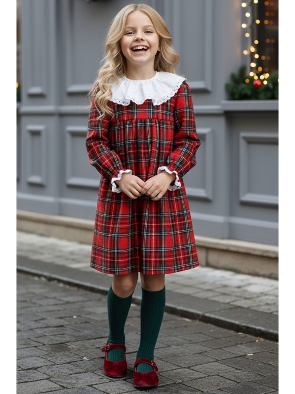لباس مجلسی دخترانه آستین بلند چهارخانه قرمز طرح توری طرح چیندار جدید
