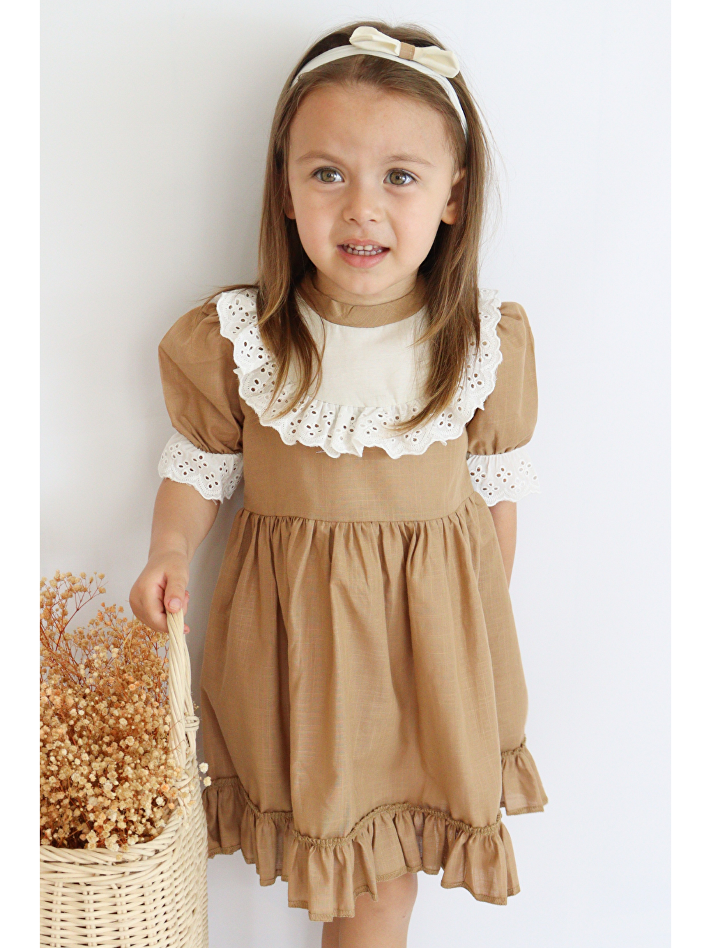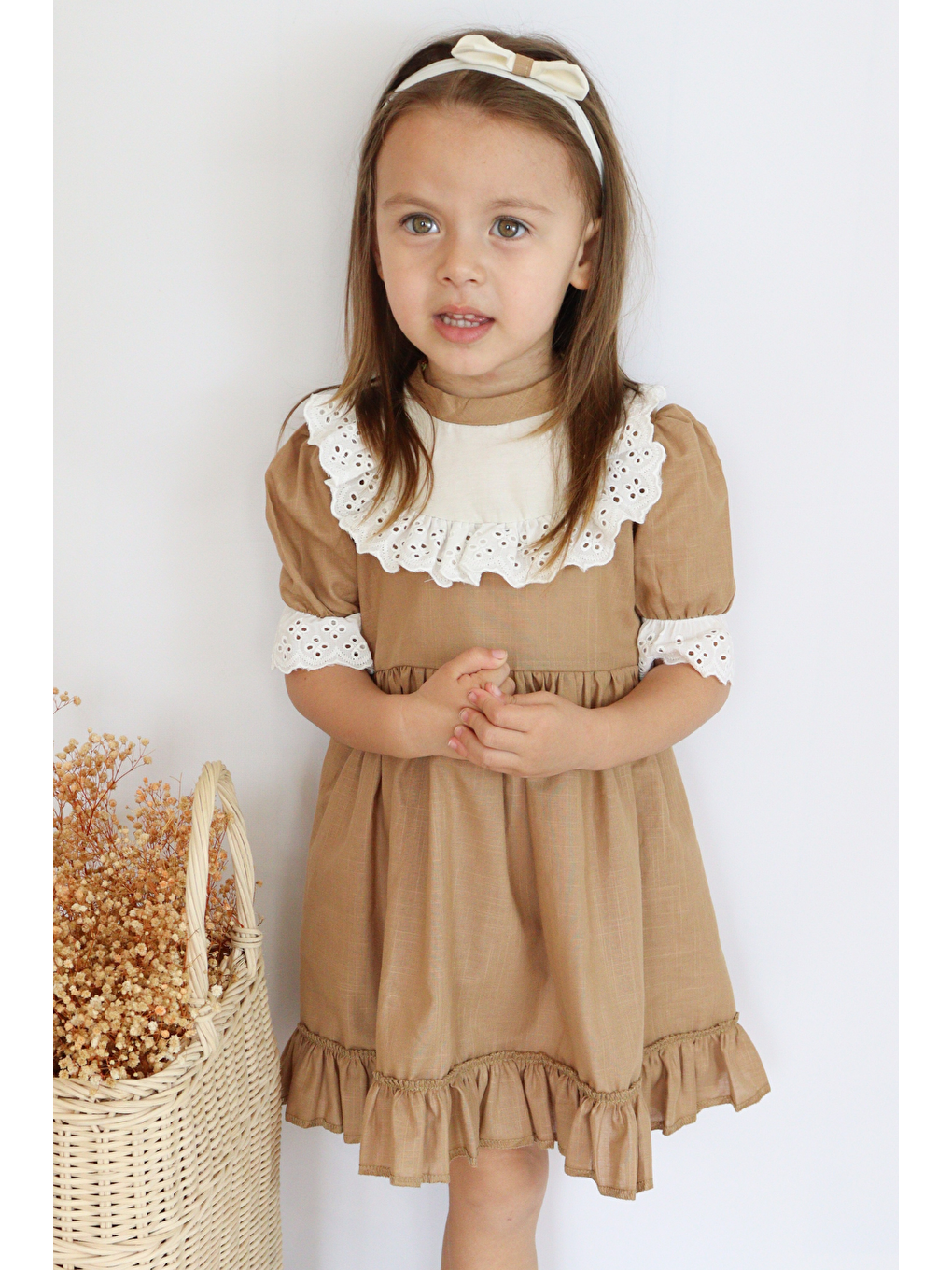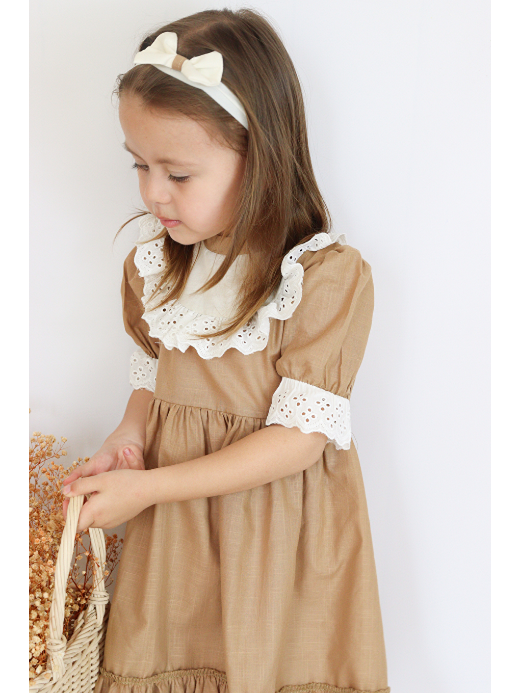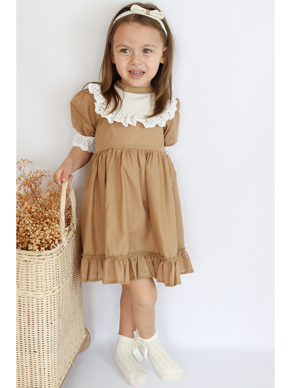 ست لباس دخترانه قهوهای طرحدار توری آستین کوتاه با جزئیات از جنس روبی و طرح باندانا
