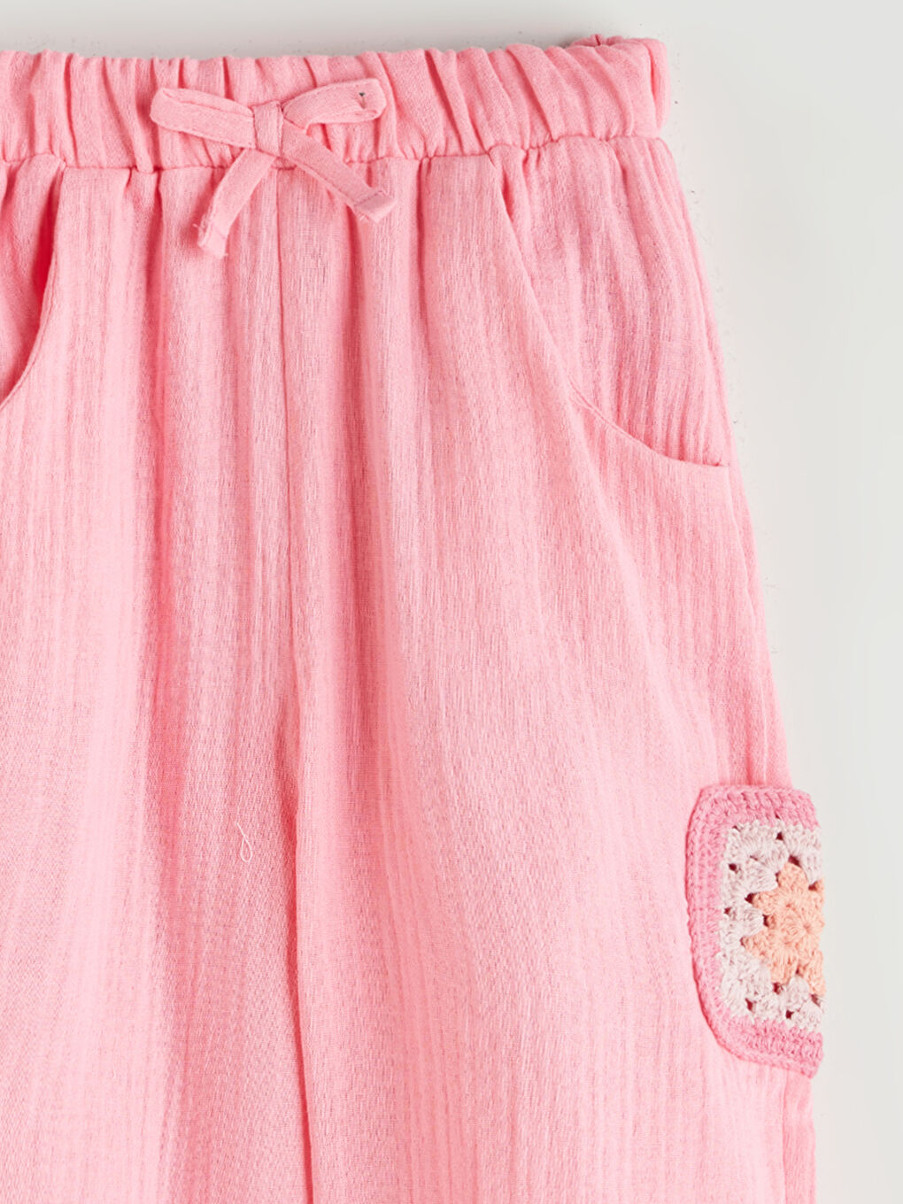شلوار گشاد دخترانه دارای کمربند کش دار و جزئیات توری است. دو جیب کاربردی در جلو با تزئینات قلاب بافی وجود دارد.