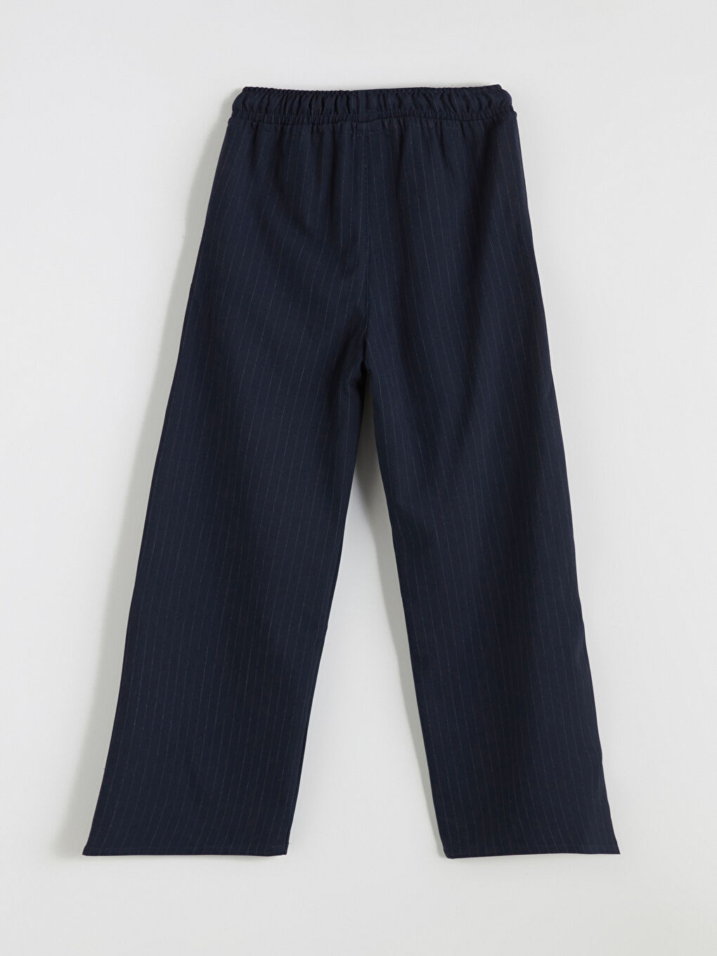 شلوار دخترانه راه راه و گشاد از پارچه گاباردین ساخته شده است. کمر و جیب های کش دار و بنددار دارند.