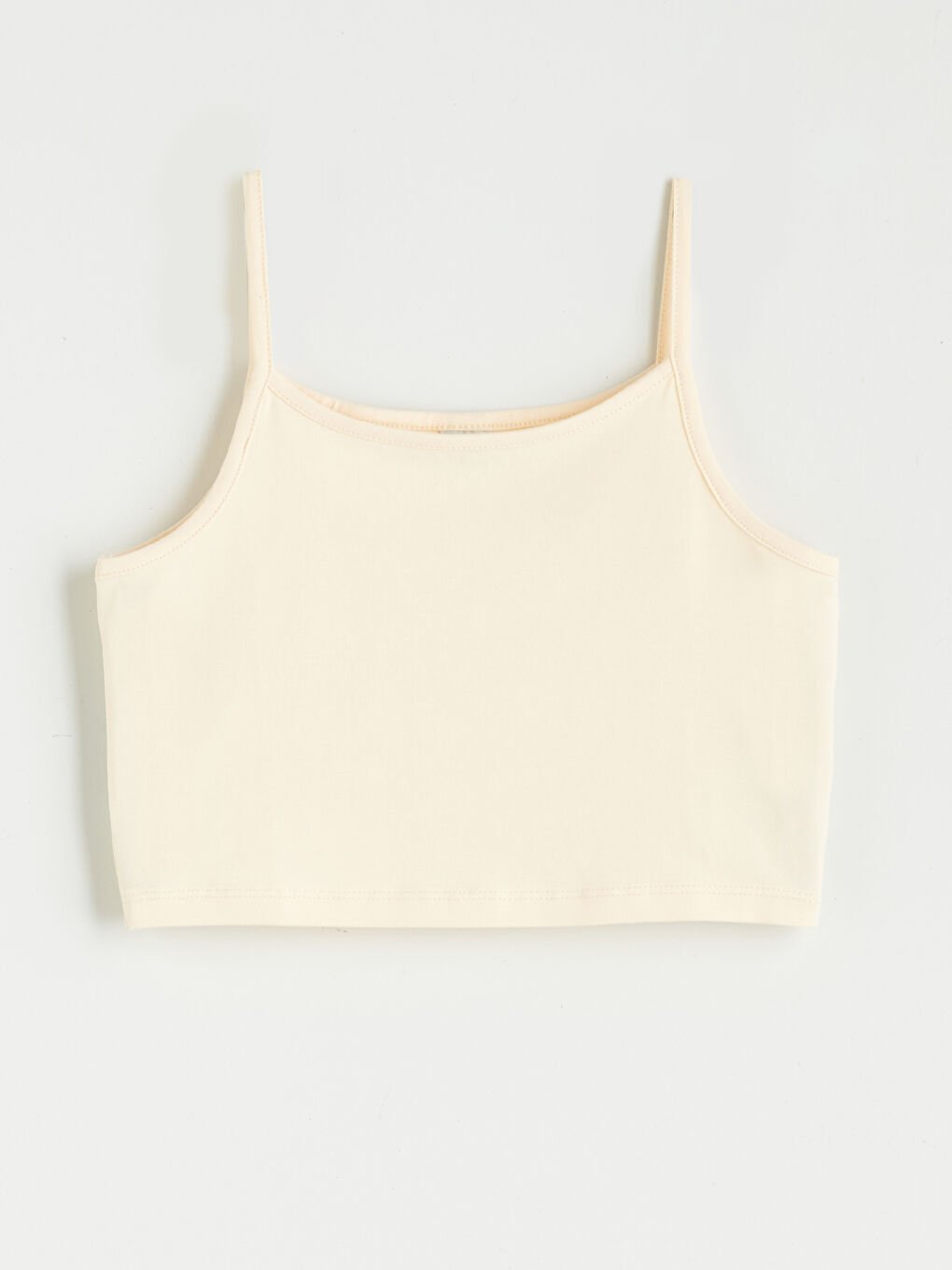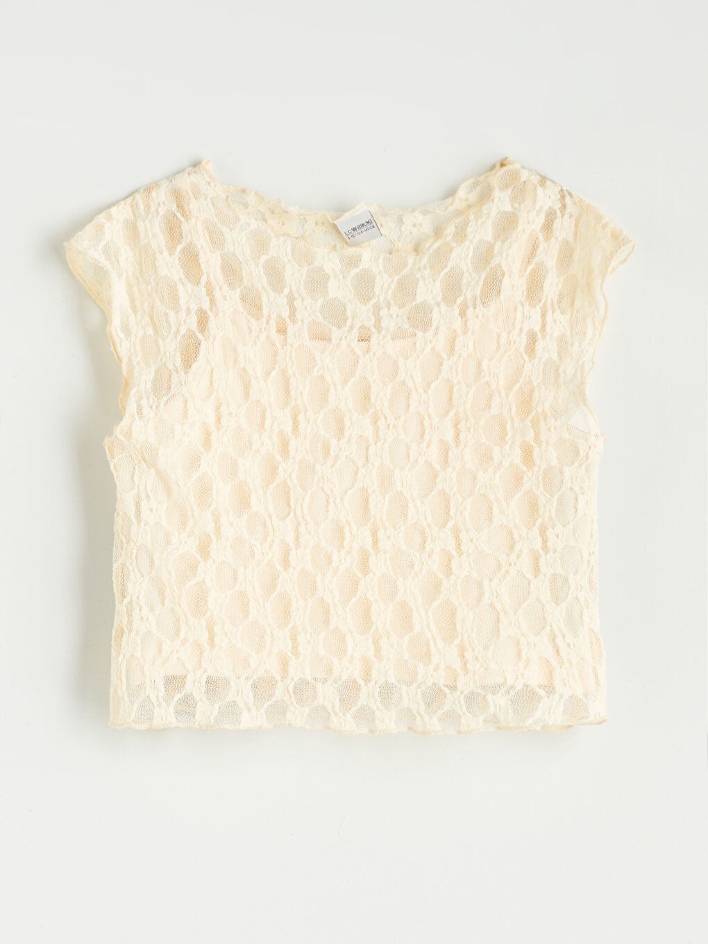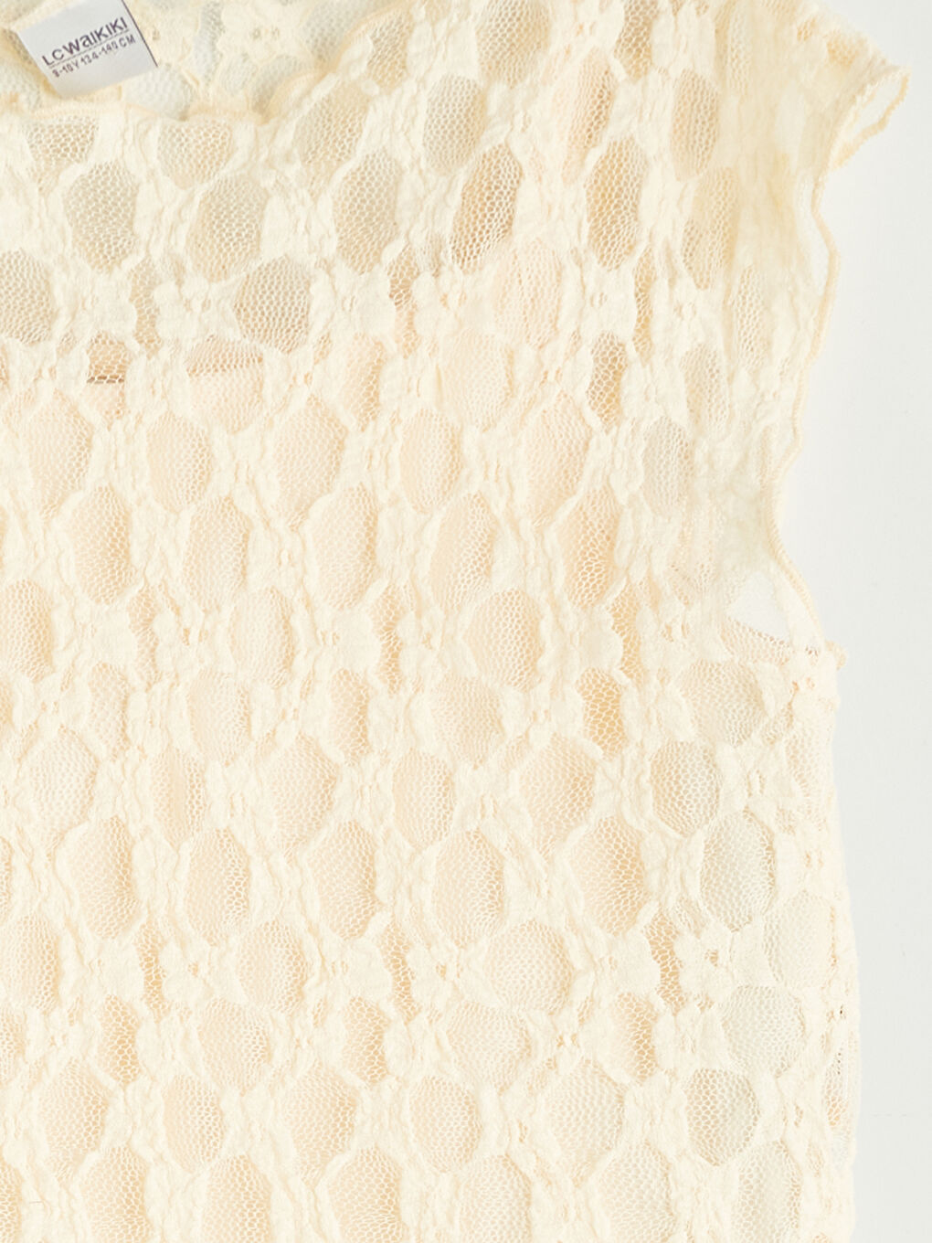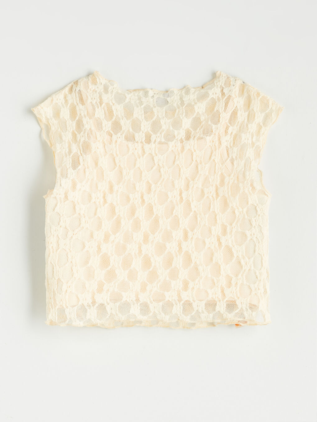 ست دو تکه دخترانه از پارچه توری نخی مرغوب. دارای یقه خدمه، تاپ بدون آستین و دامن سرآستین است.